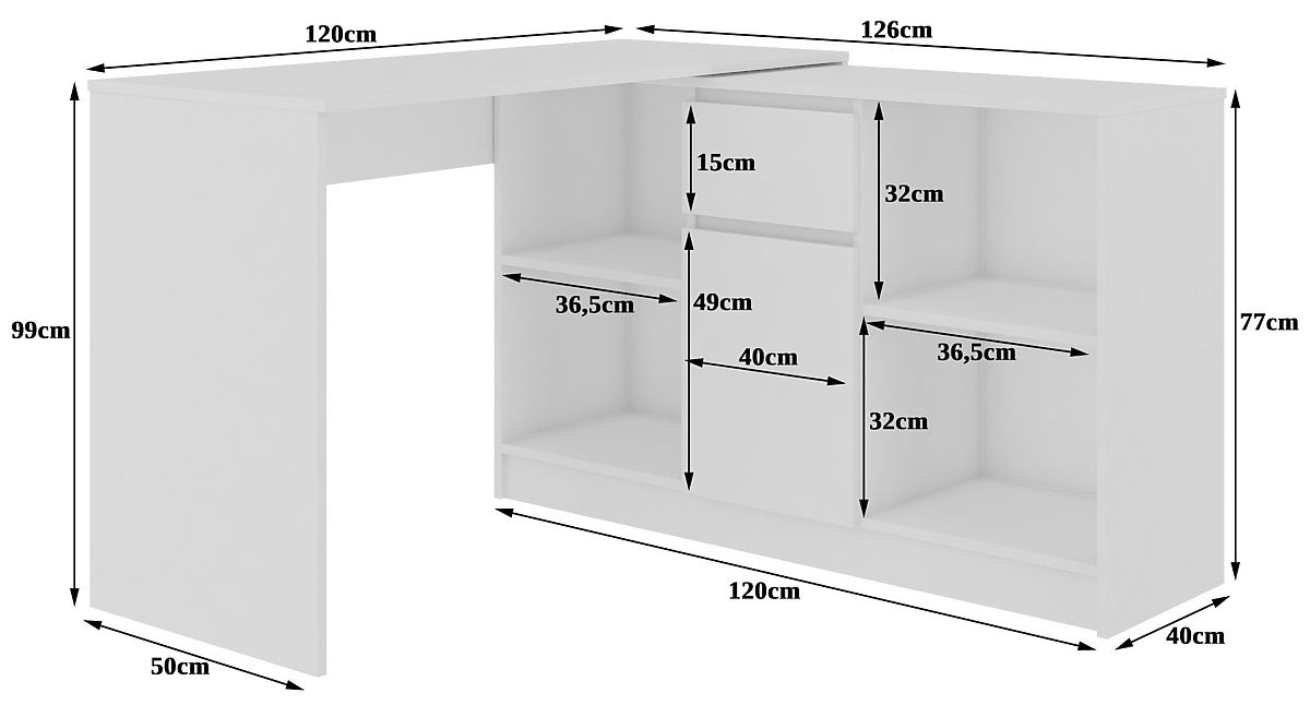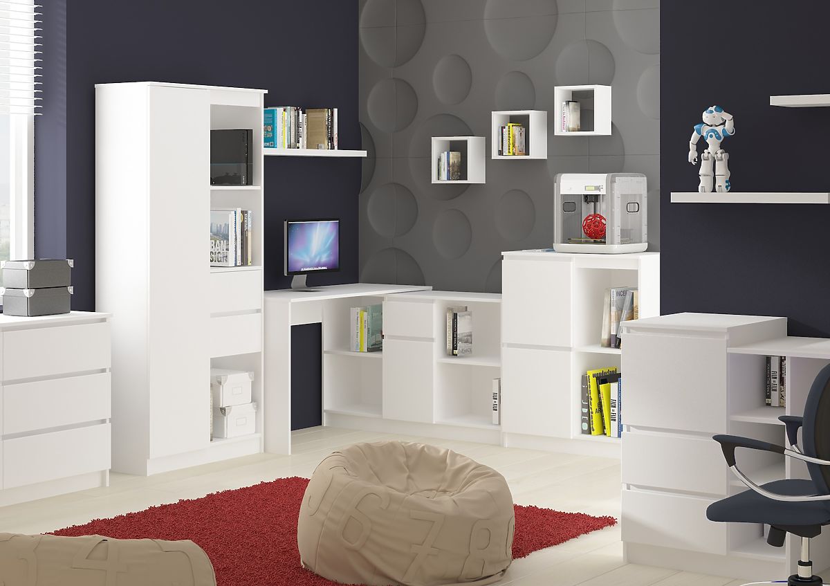 Rohový psací stůl s komodou je zajímavou a velmi moderní nabídkou vytvořenou pro osoby, které mají za úkol využít malý kancelářský prostor. Kombinace psacího stolu a komody je řešení charakterizované funkčností a zajímavým designem. Módní bílá barva se skvěle hodí do každého prostoru, přidává teplo, čistotu a útulnost aranžovanému místu.