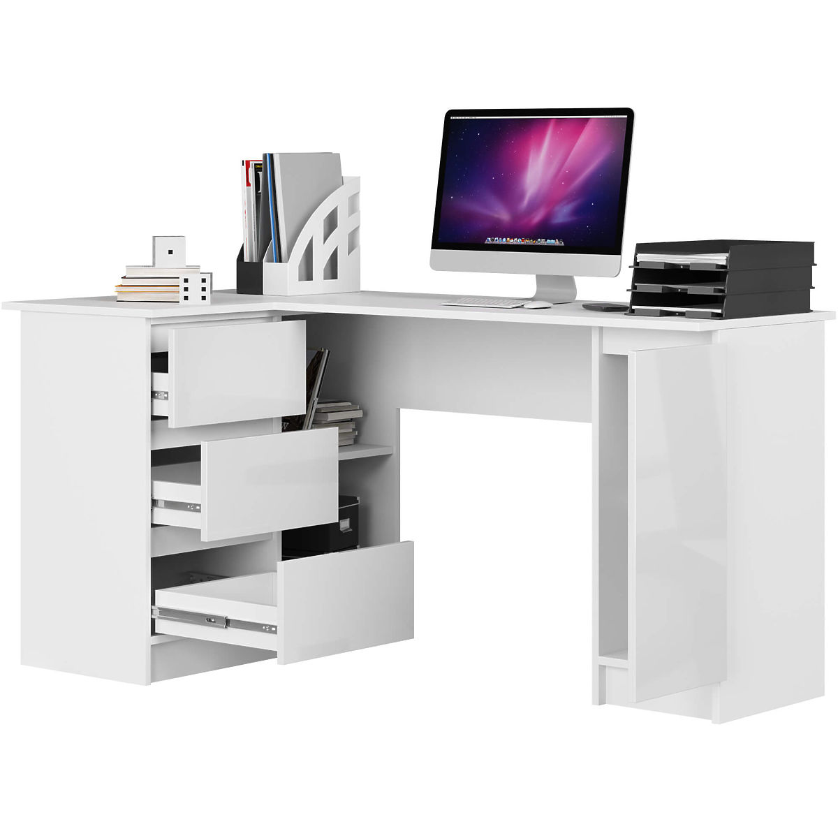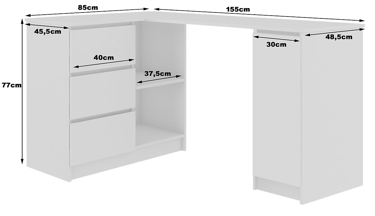 Jedním z návrhů našeho internetového obchodu je bílý rohový stůl pod notebook v moderním stylu. Skládá se ze tří zásuvek na kuličkových pojezdech, dvou otevřených polic a skříňky. Pozornost si zaslouží také velký prostor na desce stolu. Bílá je nadčasová barva, která nikdy nevyjde z módy. Navíc bílá se skvěle kombinuje s jakoukoli jinou barvou, pozitivně naladí a ovlivňuje efektivitu práce. Proto se tento návrh hodí nejen do domácí kanceláře, ale také pomůže při uspořádání krásného, moderního kancelářského prostoru v každé firmě. Zajišťujeme výhodnou cenu produktu dobré kvality. Zveme vás k nákupu.