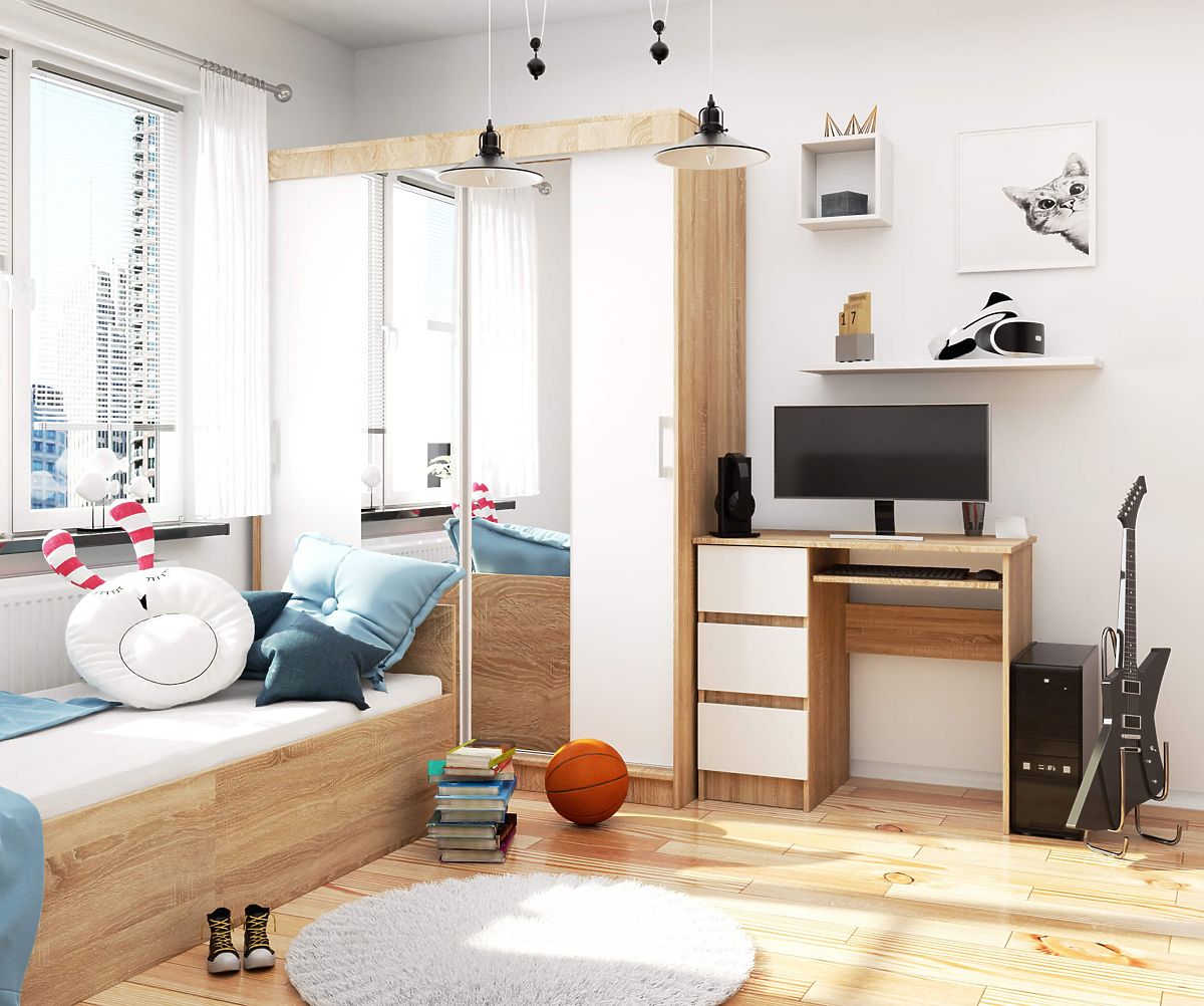 Malý a elegantní počítačový stůl A-6 v barvě dubu sonoma je ideální volbou pro mládež a milovníky moderních interiérů. Působí elegantně a odpovídá současným trendům. Nábytek, který se dokáže přizpůsobit prakticky každé, i té nejmenší místnosti, je zároveň efektivní při práci. Deska stolu o rozměrech 90 cm x 50 cm poskytne dostatek prostoru pro školní potřeby, učebnice a notebook nebo počítač.