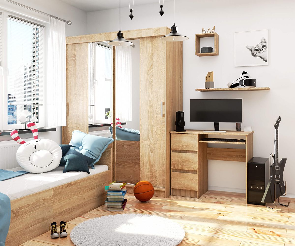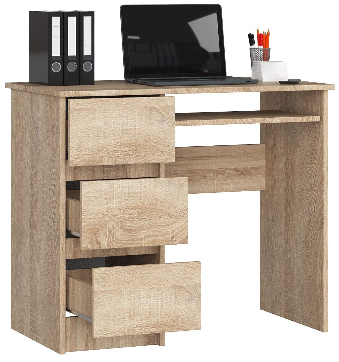 Pro ty, kteří hledají funkční psací stůl v menší velikosti, může být naše nabídka zajímavá. Prezentovaný počítačový stůl A-6 SONOMA levostranný má délku 90 cm, výšku 77 cm a hloubku 50 cm, a jeho hmotnost je 30 kg. Materiálem je vysoce kvalitní laminovaná deska, díky níž je produkt odolný proti oděru. Viditelné hrany stolu jsou opatřeny ABS hranou, což zajišťuje, že nábytek není snadno poškozen. Stůl nabízí také mnoho volného prostoru, který lze libovolně uspořádat a využít. To vše díky třem zásuvkám - uvnitř každé z nich se nachází jedna polička. Stůl obsahuje také poličku na klávesnici, která se pohybuje lehce a volně. To je možné díky kovovým válečkovým pojezdům.