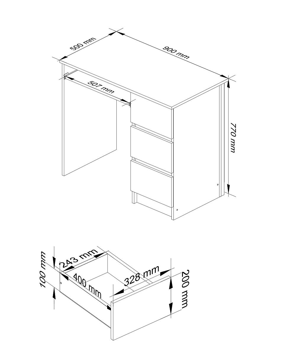 Pravostranný počítačový stůl A-6 je vyroben z vysoce kvalitní laminované desky odolné proti oděru o tloušťce až 16 mm. Nábytek je vybaven pohodlnou policí na klávesnici a třemi prostornými zásuvkami, které poskytují velký úložný prostor. Deska o rozměrech 90/50 cm je dostatečně velká, aby na ní bylo možné pohodlně umístit počítač, notebook nebo psací potřeby. Nábytek má výšku 77 cm a váží 30 kg, je tedy snadno umístitelný a zároveň dostatečně prostorný, aby se do něj vešly potřebné pracovní předměty.