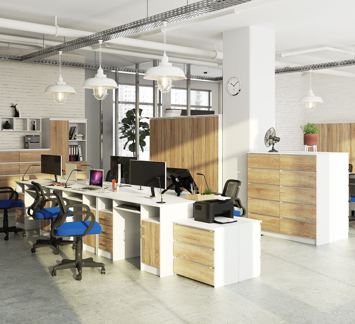 Psací stůl ANA byl navržen s ohledem na kancelářské a pracovny. Samozřejmě se velmi dobře hodí i jako studentský stůl. Klasická barevná kombinace bílá a sonoma umožňuje snadné přizpůsobení do každého interiéru. Velká plocha desky nám umožňuje libovolné umístění monitoru. Klávesnici můžeme umístit na výsuvnou polici pod deskou. Stůl nabízí velké množství prostoru pro uspořádání, otevřené police, zásuvky a skříňku s policí. Celá konstrukce je vyrobena z laminované desky odolné proti oděru.