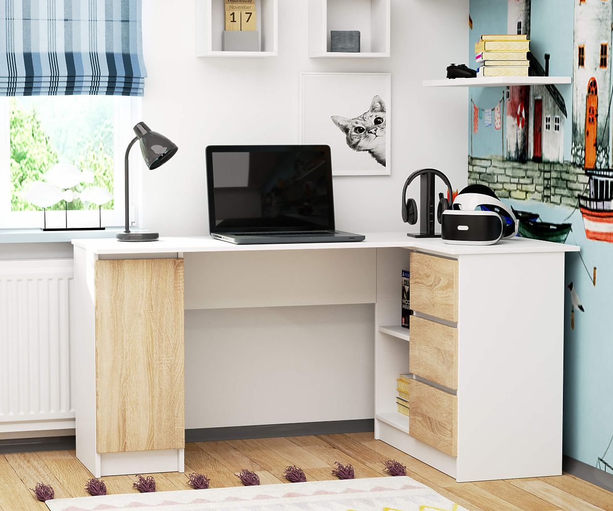 Počítačové stoly jsou typem nábytku, bez kterého si mnoho lidí nedokáže představit svůj byt nebo kancelář. V poslední době jsou velmi oblíbené rohové stoly, které poskytují maximální pohodlí. Doporučeníhodný je rohový stůl B20 se šířkou desky 155 cm. Je to moderní nábytek v bílé barvě s přídavkem barvy sonoma (čela zásuvek a skříňky). Stůl nabízí mnoho volného prostoru k využití. Nábytek usnadňuje používání počítače, umožňuje efektivní práci a studium. Hodí se do obývacího pokoje a pokoje pro mládež, stejně jako do kanceláře a pracovny.