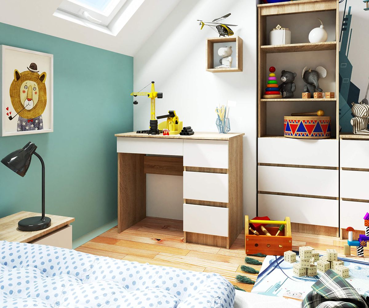 Psací stůl se čtyřmi zásuvkami určený pro mládež.