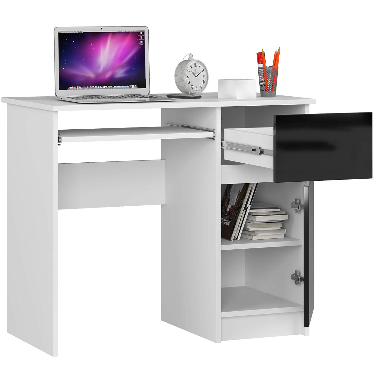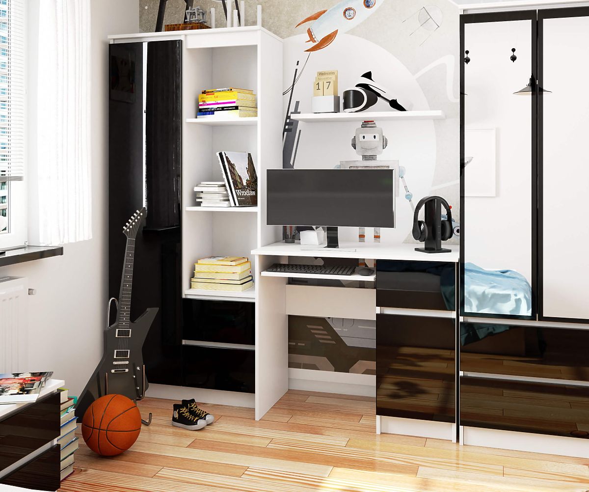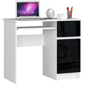 Počítačový stůl PIKSEL díky klasické kombinaci barev: bílá a černá s leskem, je výrazným moderním nábytkem. Stůl je vyroben z kvalitní laminované desky odolné proti oděru. Jeho jednoduchá a pevná konstrukce chráněná ABS hranou zaručuje dlouhou životnost nábytku. Na desce stolu je dostatek prostoru pro umístění monitoru počítače, zatímco pro klávesnici je určena samostatná, výsuvná police. Zásuvka a prostorná boční skříňka s policí jsou ideálním místem pro ukládání. Stůl se perfektně hodí do malých prostor, jako je dětský pokoj, domácí kancelář nebo malé kanceláře.