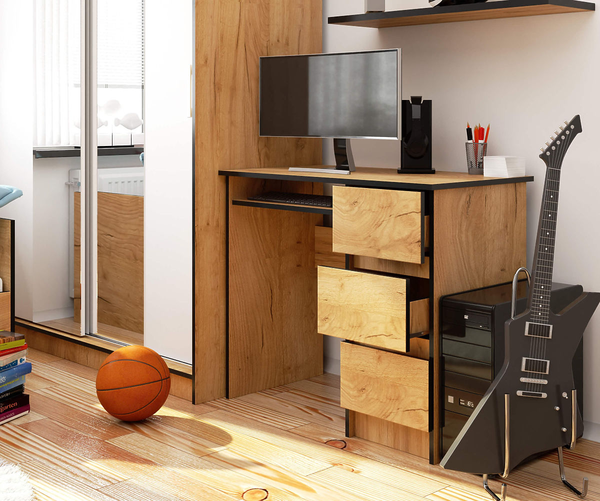 Psací stůl A-6 90 cm v odstínu dub craft, díky svému univerzálnímu a zároveň nadčasovému vzhledu a charakteru, dokonale zapadne do klasického nebo moderního interiéru dětského či mládežnického pokoje. Může být také úspěšně využit jako součást vybavení domácí kanceláře. Vše záleží na individuálních potřebách a preferencích jednotlivce. Díky tomu, že je stůl vybaven 3 praktickými zásuvkami, získáváme další prostor pro uspořádání a ukládání různých věcí, které chceme mít po ruce.