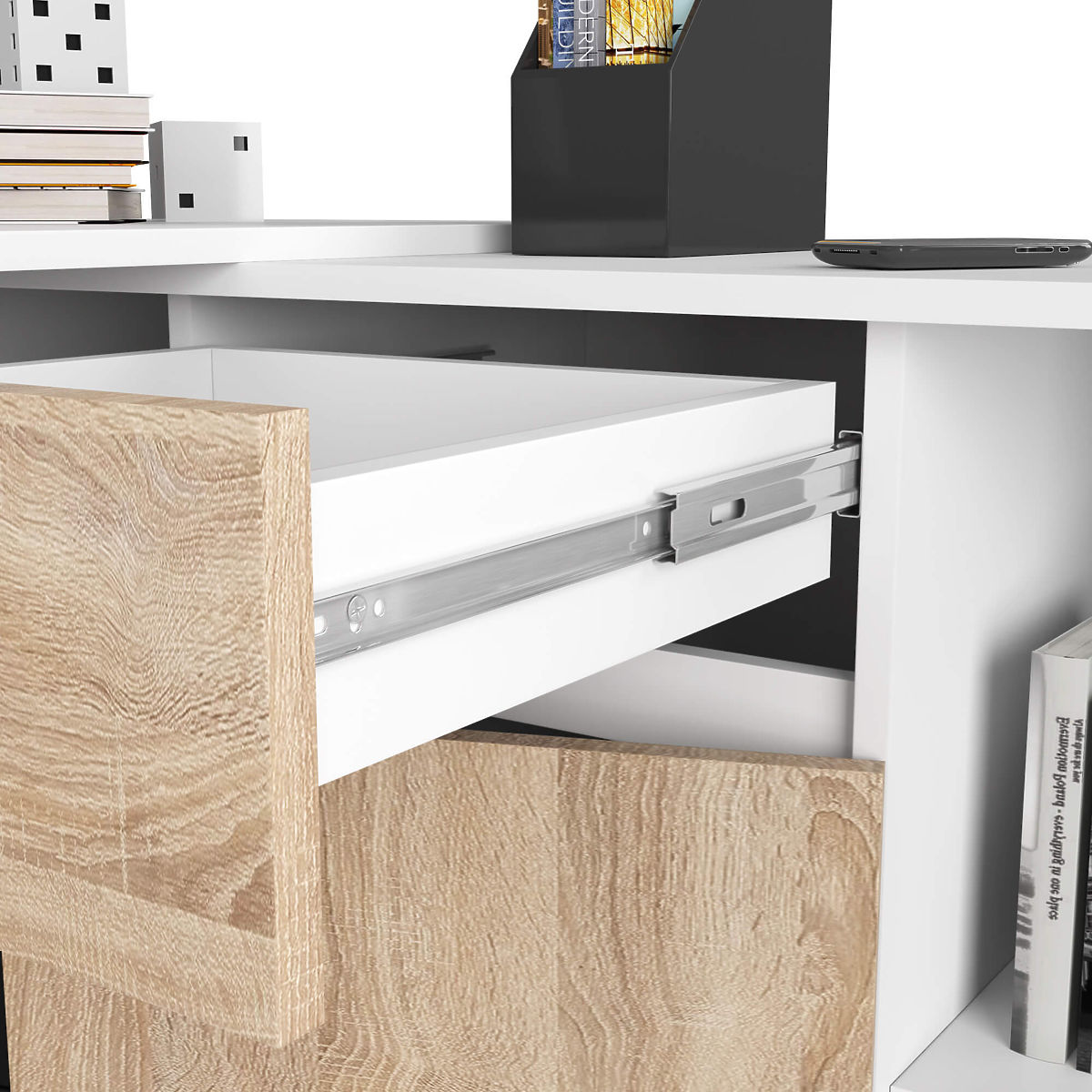Rohový stůl B-17 bílý/sonoma byl vyroben v nábytkovém systému výrobce (CLP), což umožňuje jeho kombinaci s dalšími nábytky systému. Komfortní, velký stůl je ideální jak do dětského, studentského pokoje, tak i do pracovního nebo studijního prostoru zařízeného v obývacím pokoji nebo ložnici. Skvěle se hodí i do komorní kanceláře.