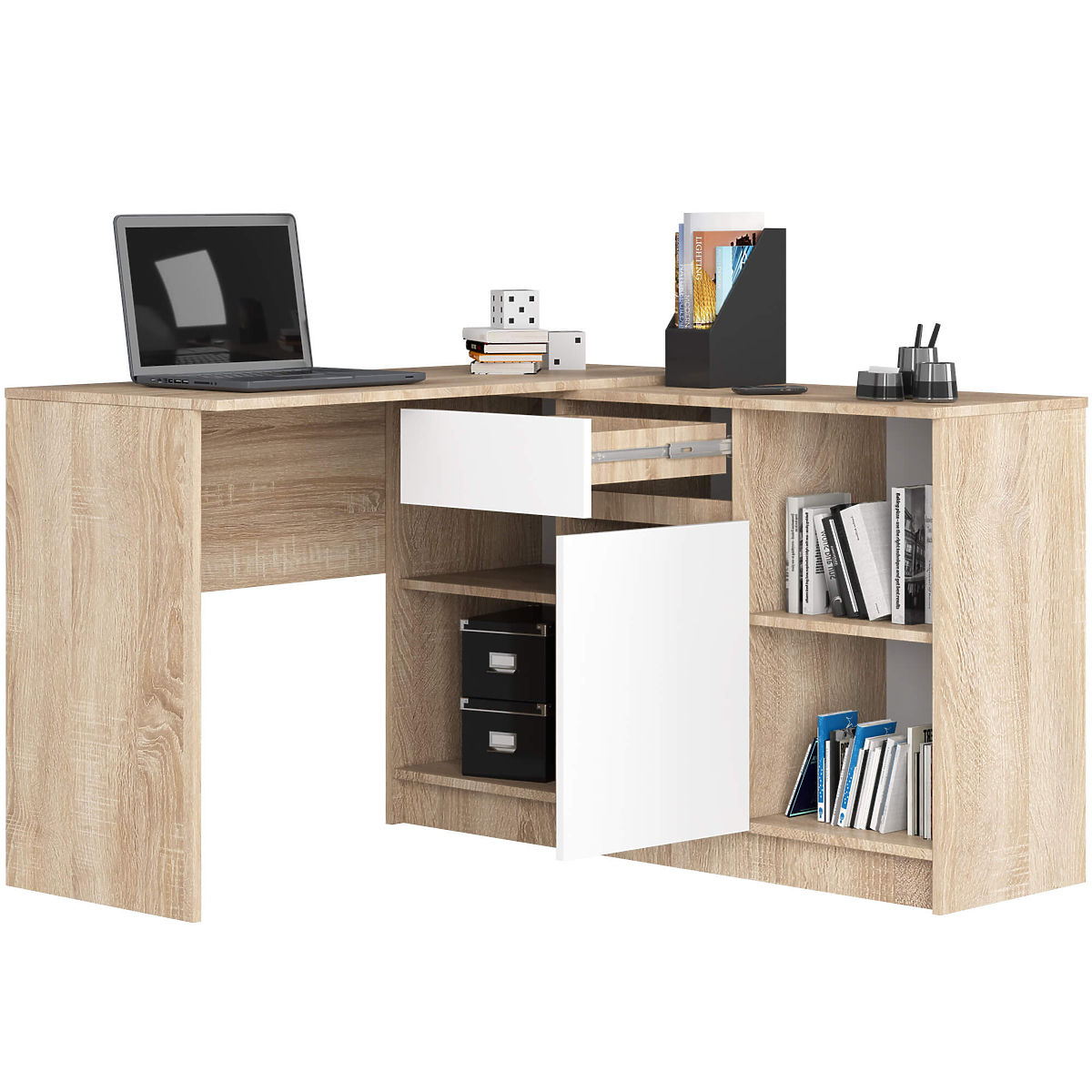 Rohová sestava stolu a komody pro efektivní využití prostoru. .. více