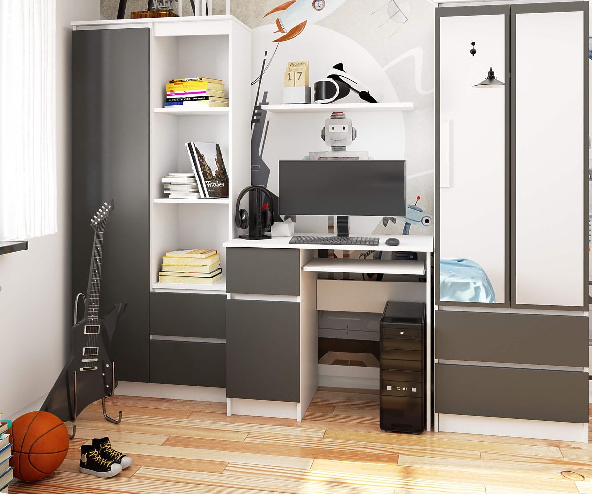 Počítačový stůl PIKSEL bílý/grafitově šedý je skvělý pro použití v dětském, studentském pokoji, nebo v ložnici či obývacím pokoji, kde je vyhrazený kout pro práci z domova nebo studium. Uplatní se také v malých kancelářských prostorách, kde skvěle ladí s dalším nábytkem v bezúchytkovém systému.