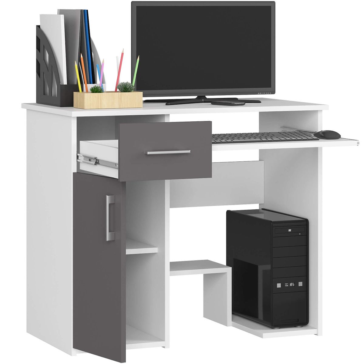 Musí být kvalitní počítačové stoly drahé? Ne nutně! Příkladem je psací stůl JAY 90 cm v bílé barvě s čelními plochami v grafitově šedé barvě. Je to funkční nábytek, který usnadní organizaci práce a studia před obrazovkou počítače. Skvěle se hodí do obývacího pokoje, denního pokoje, mládežnického pokoje nebo kanceláře, kde zaujme vysokou estetikou provedení.