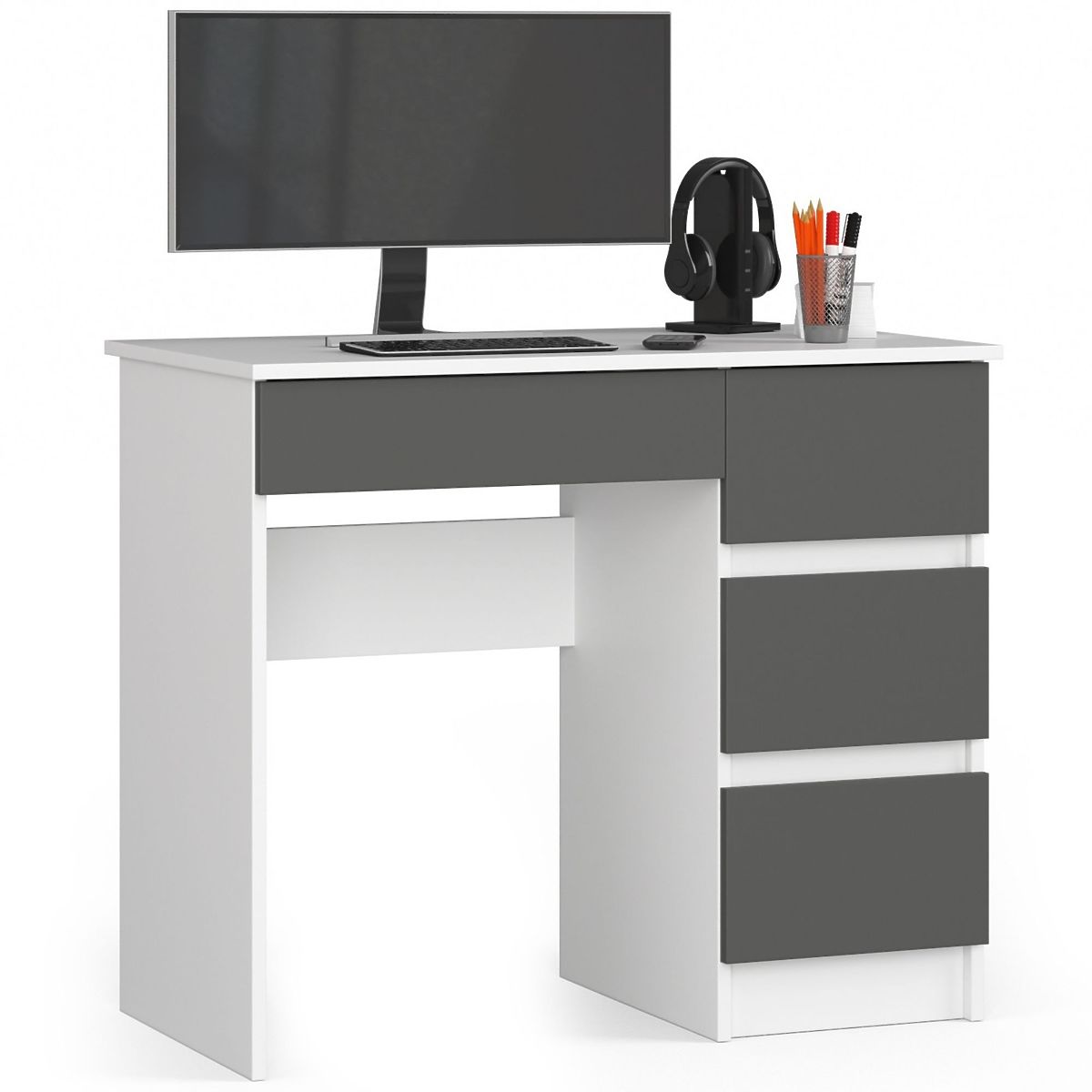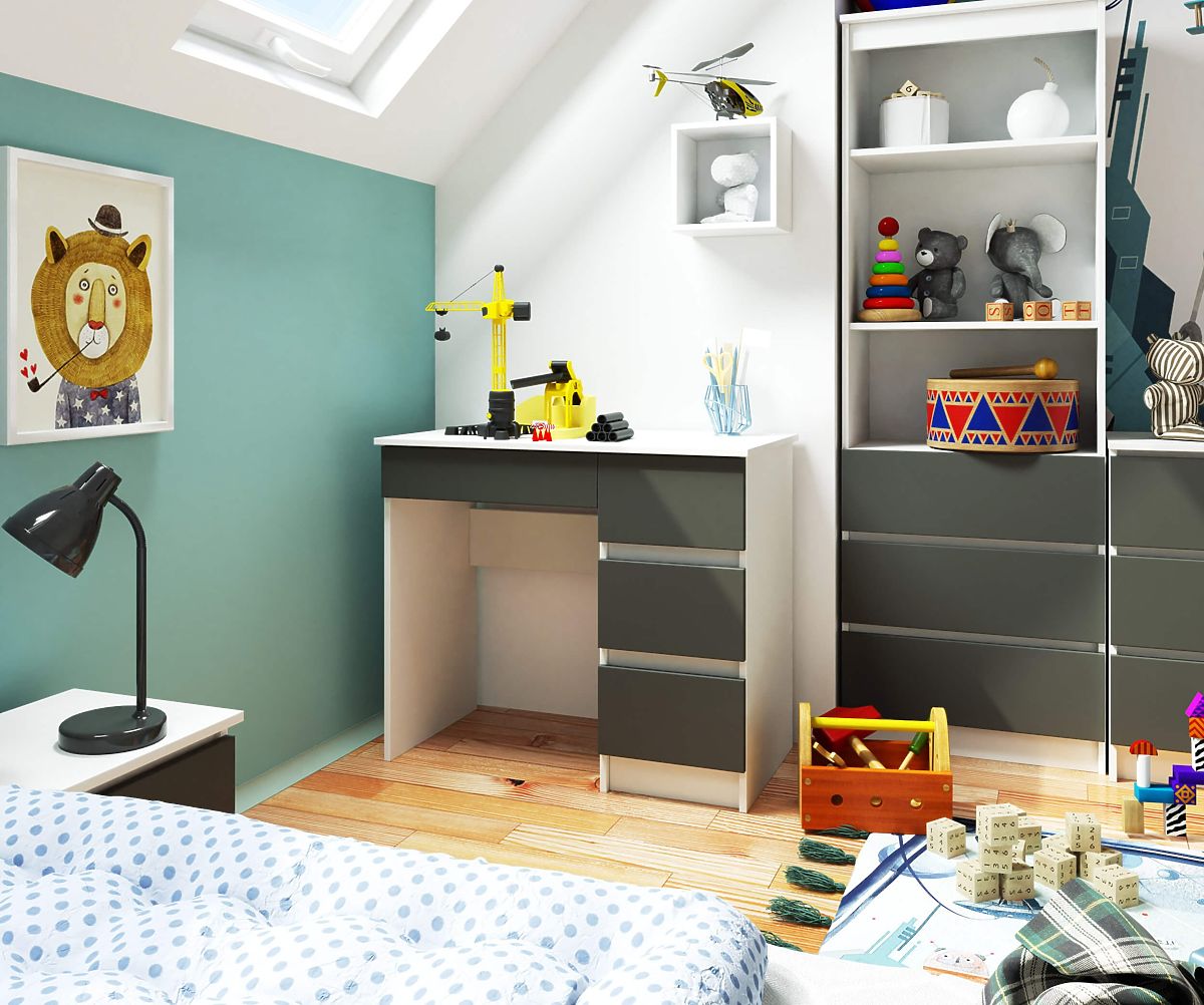 Počítačový stůl A-7 je malý kus nábytku, který najde uplatnění v malém prostoru - kancelářském nebo obytném. Hodí se například do domácí kanceláře nebo dětského/mládežnického pokoje. Prezentovaný produkt kombinuje dvě kontrastní, ale skvěle se doplňující barvy - grafitově šedou a bílou. Skládá se ze tří zásuvek určených k libovolnému uspořádání. Jednoduchý ve své formě, ale mimořádně funkční nábytek jistě ocení ti, kteří chtějí vytvořit pracovní nebo studijní koutek, ale nemají k dispozici mnoho místa.