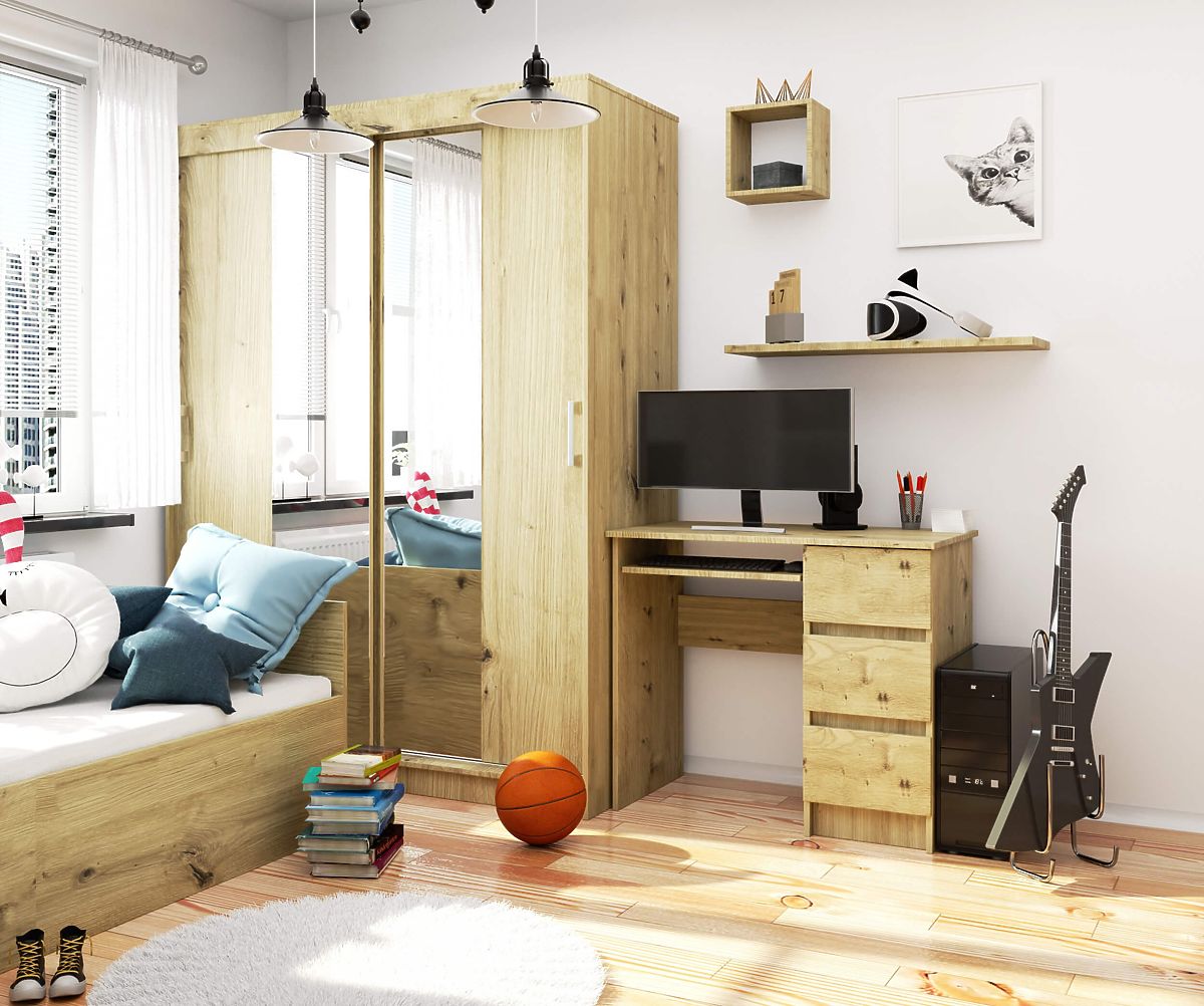 Psací stůl vyrobený z laminované desky je produkt, který se vyznačuje vysokou odolností proti oděru, díky čemuž zůstane v dokonalém stavu po dlouhou dobu. Jeho univerzální vzhled zajišťuje, že se bude skvěle hodit do každé místnosti. Nábytek je vybaven deskou, výsuvnou policí a třemi prostornými zásuvkami, které lze uspořádat podle individuálních potřeb.