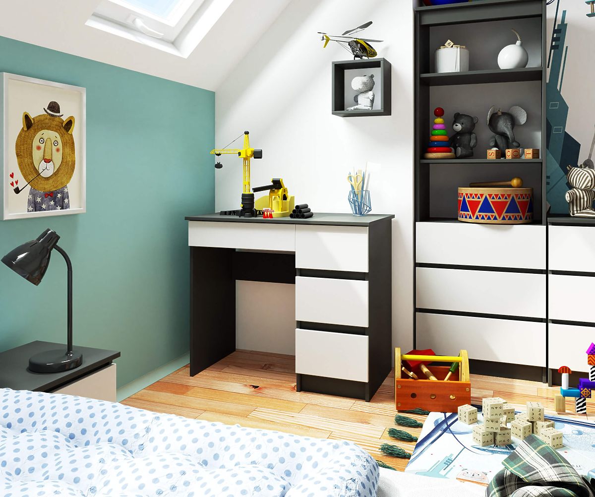Psací stůl se čtyřmi zásuvkami určený pro mládež.