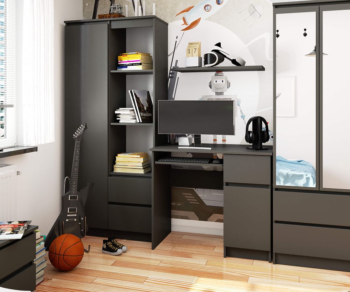 Volně stojící stůl PIKSEL 90 cm v barvách GRAFIT ŠEDÁ je ideálním řešením pro malé interiéry. Velmi dobře poslouží jako školní nebo počítačový stůl. Jeho ergonomická konstrukce zajišťuje pohodlí při používání. Stůl je vybaven výsuvnou policí na klávesnici, praktickou boční zásuvkou a skříňkou s policí, do které se snadno vejdou šanony a knihy. K výrobě stolu byla použita příjemná na dotek a snadno udržovatelná matná deska pokrytá odolnou laminátovou vrstvou. Celek doplňují praktické úchyty ve stříbrné barvě.
