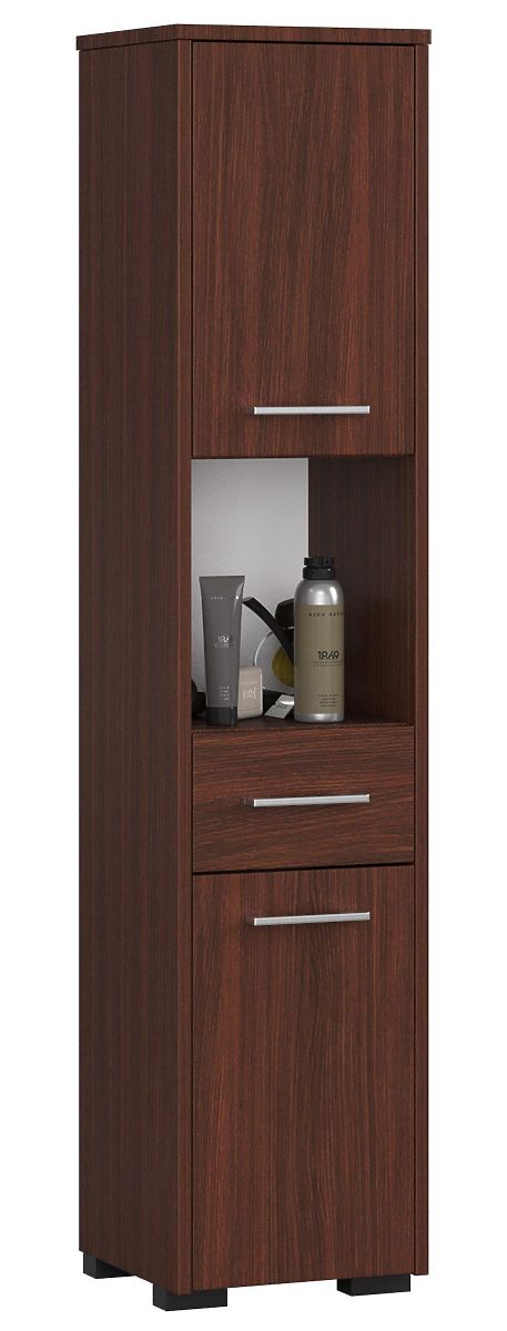 Koupelnový regál je ideální nábytek, který pomůže vyplnit prázdné místo v koupelně a zároveň schovat všechny předměty, které to vyžadují. Místo přeplněných praček, umyvadel nebo zrcadlových polic nabízíme estetický regál, který nejen pojme většinu kosmetiky, ale především krásně vypadá. Navíc umožňuje uchovávat nejpotřebnější věci na dosah ruky. Vejdou se do něj jak šampony a tekutiny, tak ručníky. Koupelnový regál je vyroben z laminované desky, která je odolná proti oděru. Navíc, vzhledem k trvalé přítomnosti vlhkosti, je vyroben z materiálů chránících před deformací při kontaktu s vodou. Regál se skládá z horní uzavřené police, střední části bez uzavření, zásuvky a spodní části. Každý z uzavřených prvků má úchyt stylově sladěný s barvami čel nábytku. Koupelnový regál je dostupný v módní barvě wenge.