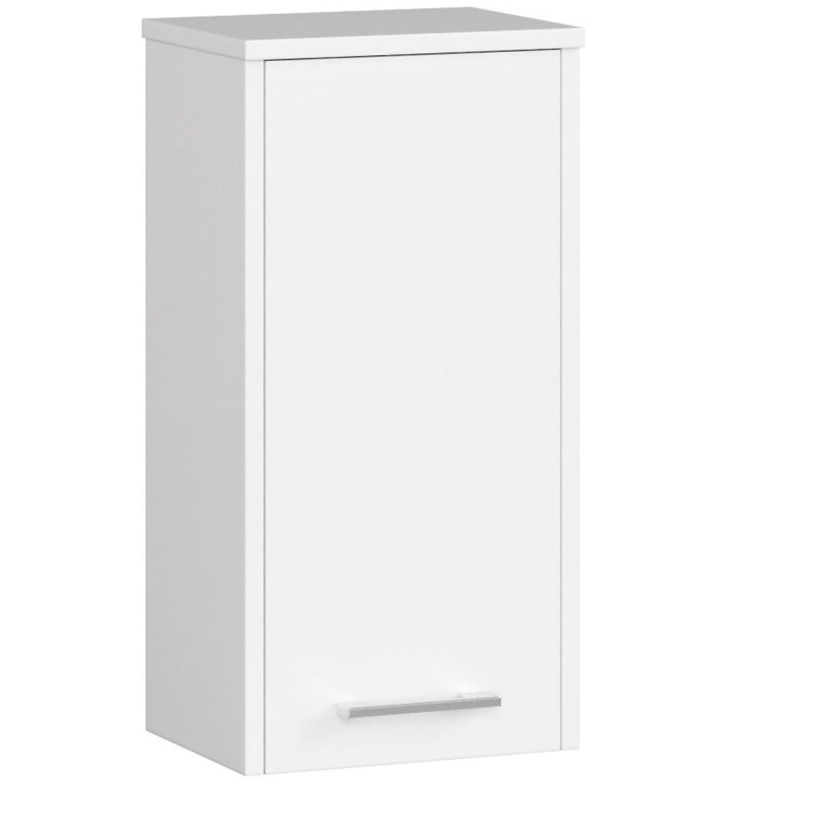 Závěsná koupelnová skříňka s jedněmi dveřmi a univerzální bílou barvou. .. více