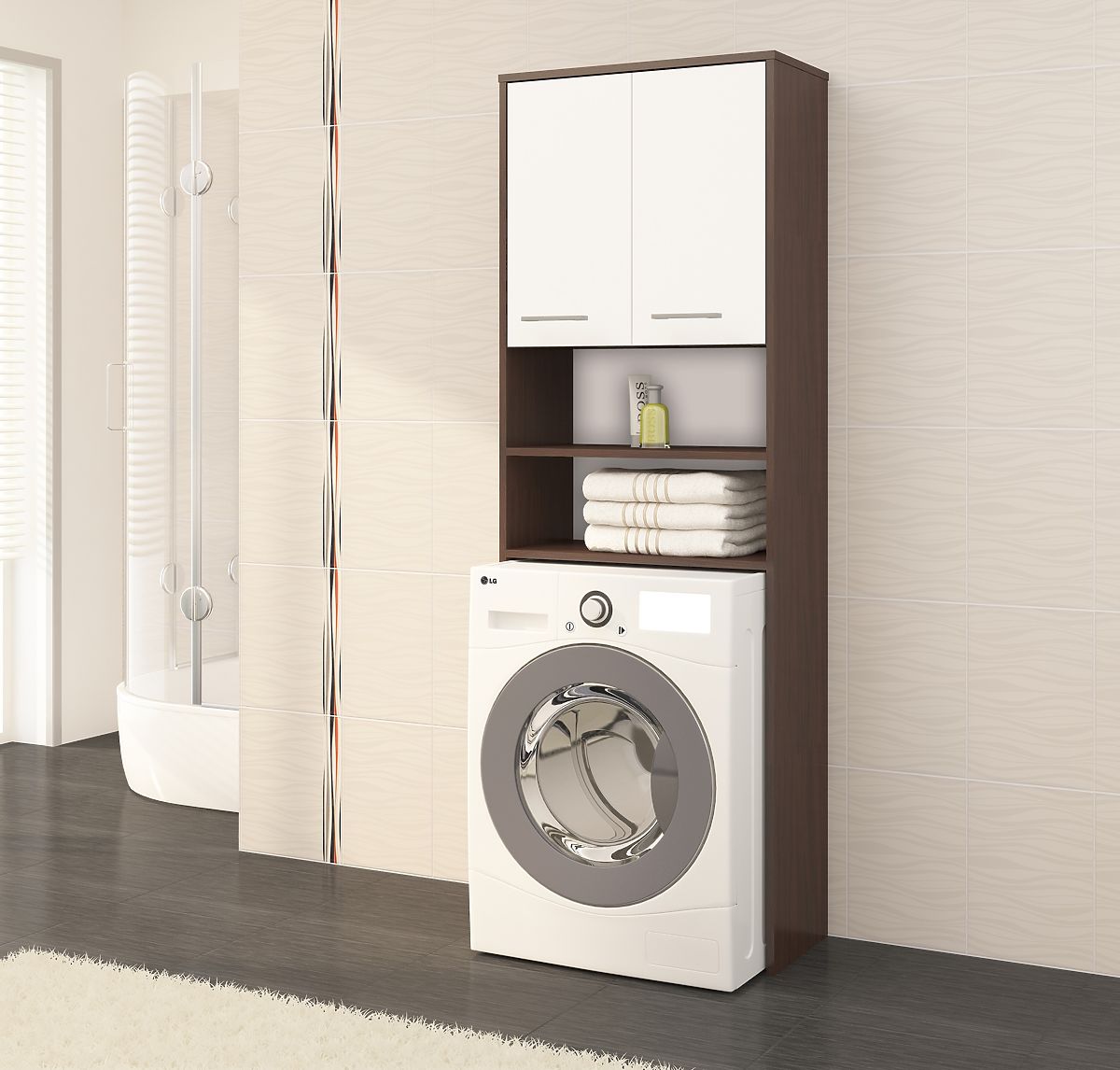 Koupelnová skříňka nad pračku s bílými dvířky a wenge korpusem. .. více