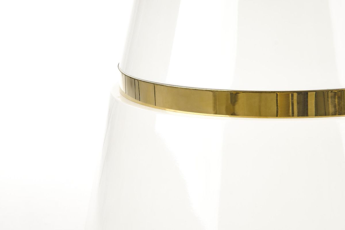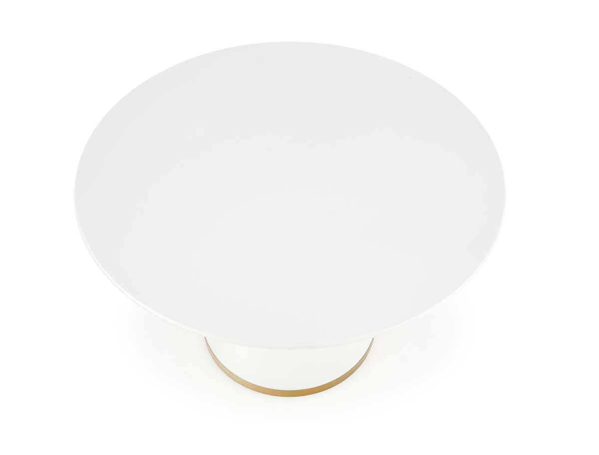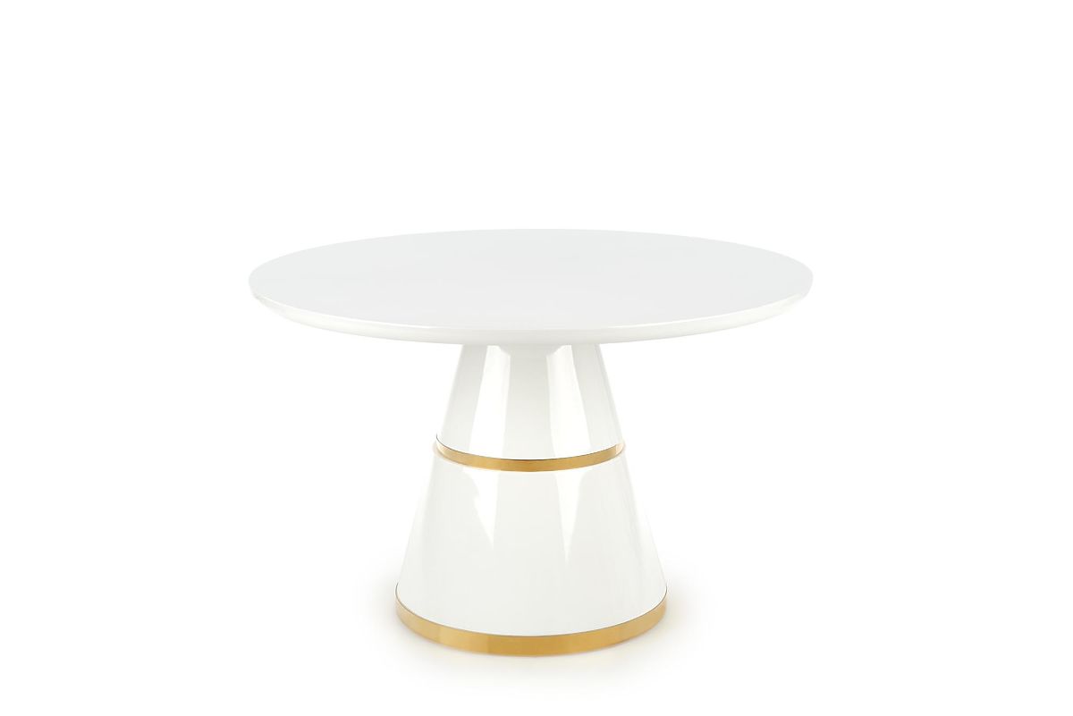 Stůl je vyroben z bíle lakované MDF, která je odolná, pevná a zároveň snadná na údržbu. Masivní centrální sloup se směrem dolů rozšiřuje, čímž zajišťuje stabilitu, a zároveň působí velmi luxusně díky chromovaným zlatým vložkám. Díky čistě bílé barvě dokáže stůl opticky prosvětlit a zvětšit každý prostor, takže skvěle zapadne i do menších místností.