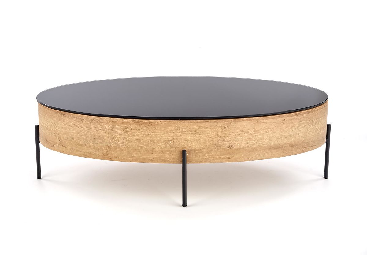Vneste do svého obývacího pokoje moderní eleganci s oválným konferenčním stolkem Zinga. Kombinace černého skla a dýhované MDF v dekoru dub zlatý vytváří stylový a nadčasový vzhled, který skvěle doplní každý moderní interiér.