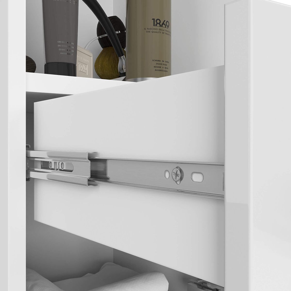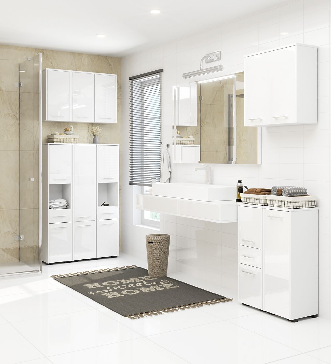 Bílý koupelnový regál s lesklými čelními plochami a stříbrnými úchyty. .. více