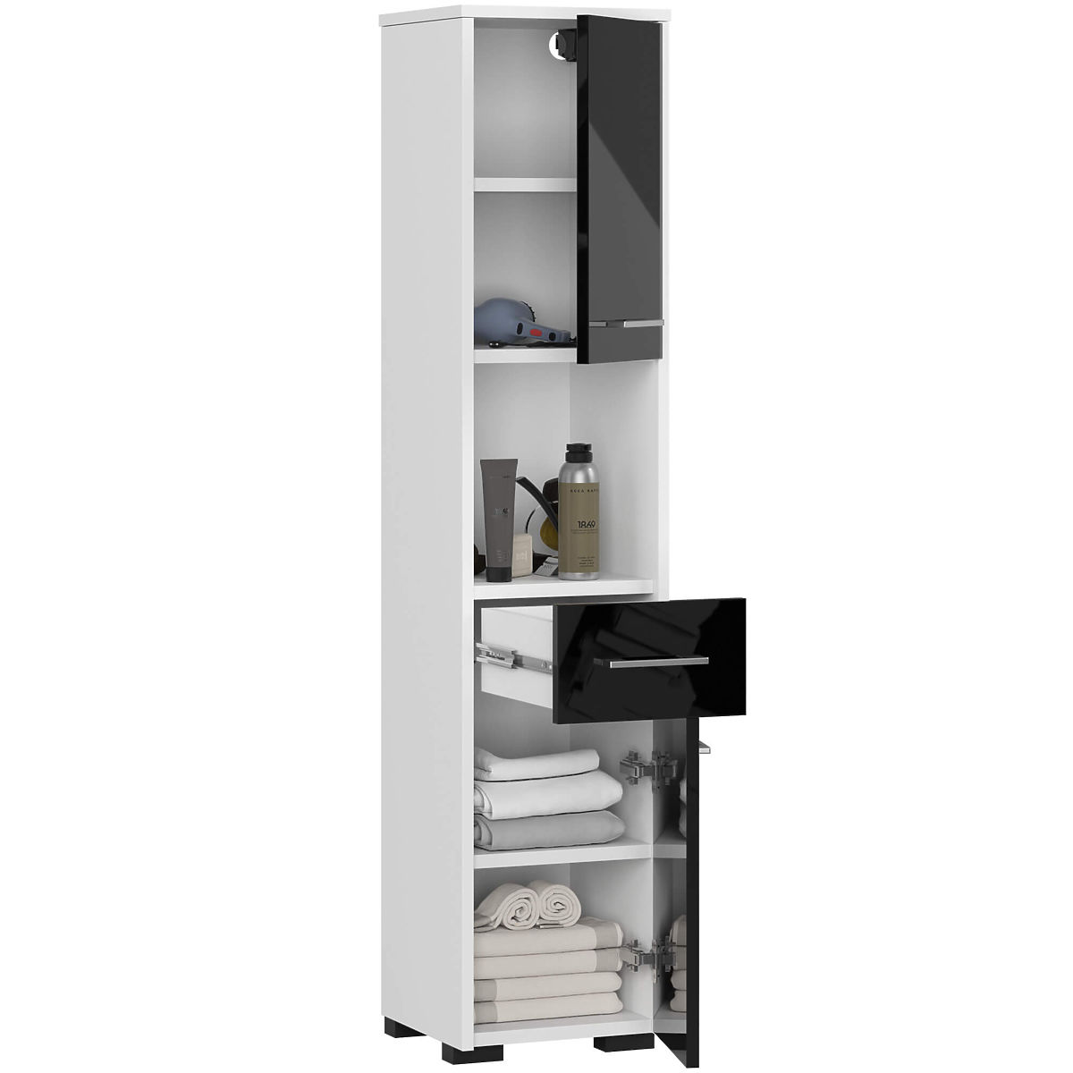 Koupelnové regály jsou funkční nábytek, který umožňuje udržovat pořádek v koupelně. Uvnitř můžete uložit ručníky, kosmetiku a další příslušenství spojené s osobní hygienou. Regály mohou zároveň vypadat stylově. Příkladem je koupelnový regál FIN 2D 1SZ 1W, který přitahuje pozornost svou barevností - kombinací bílé s černým leskem. Celek doplňují stříbrné úchyty na dvířkách. Nábytek se skládá z police, zásuvky a dvou skříní, což poskytuje mnoho volného prostoru k využití. Zároveň se vyznačuje trvanlivostí a solidním zpracováním.