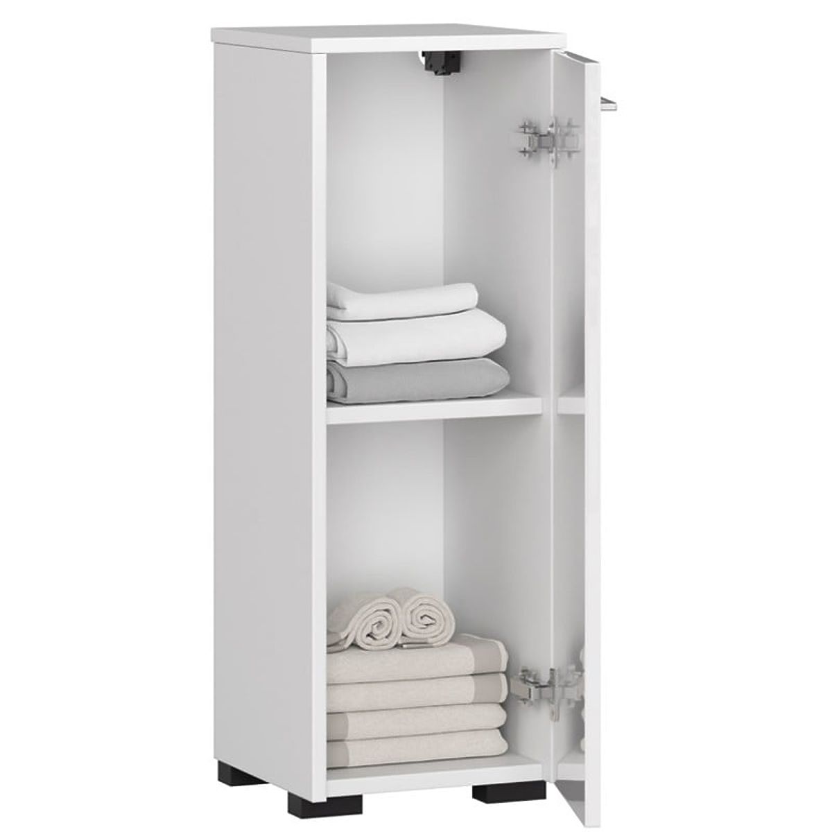 Koupelnová skříňka s výklopnými dvířky. Stojící verze komody s policí uvnitř dvířek. Barva bílá, čelní plochy bílý lesk.