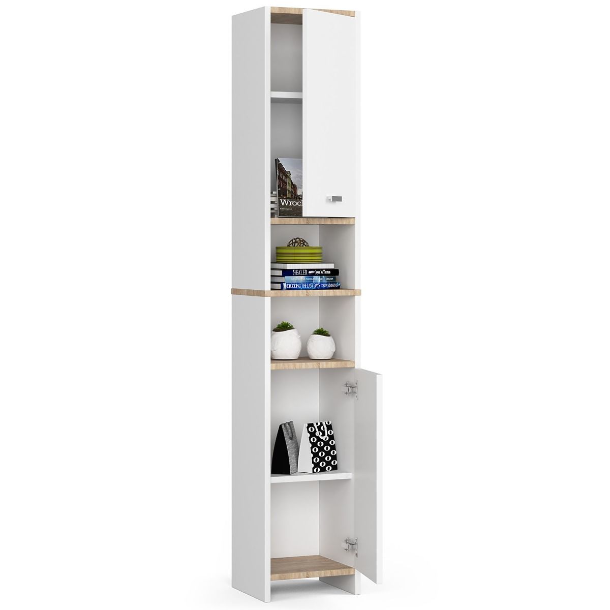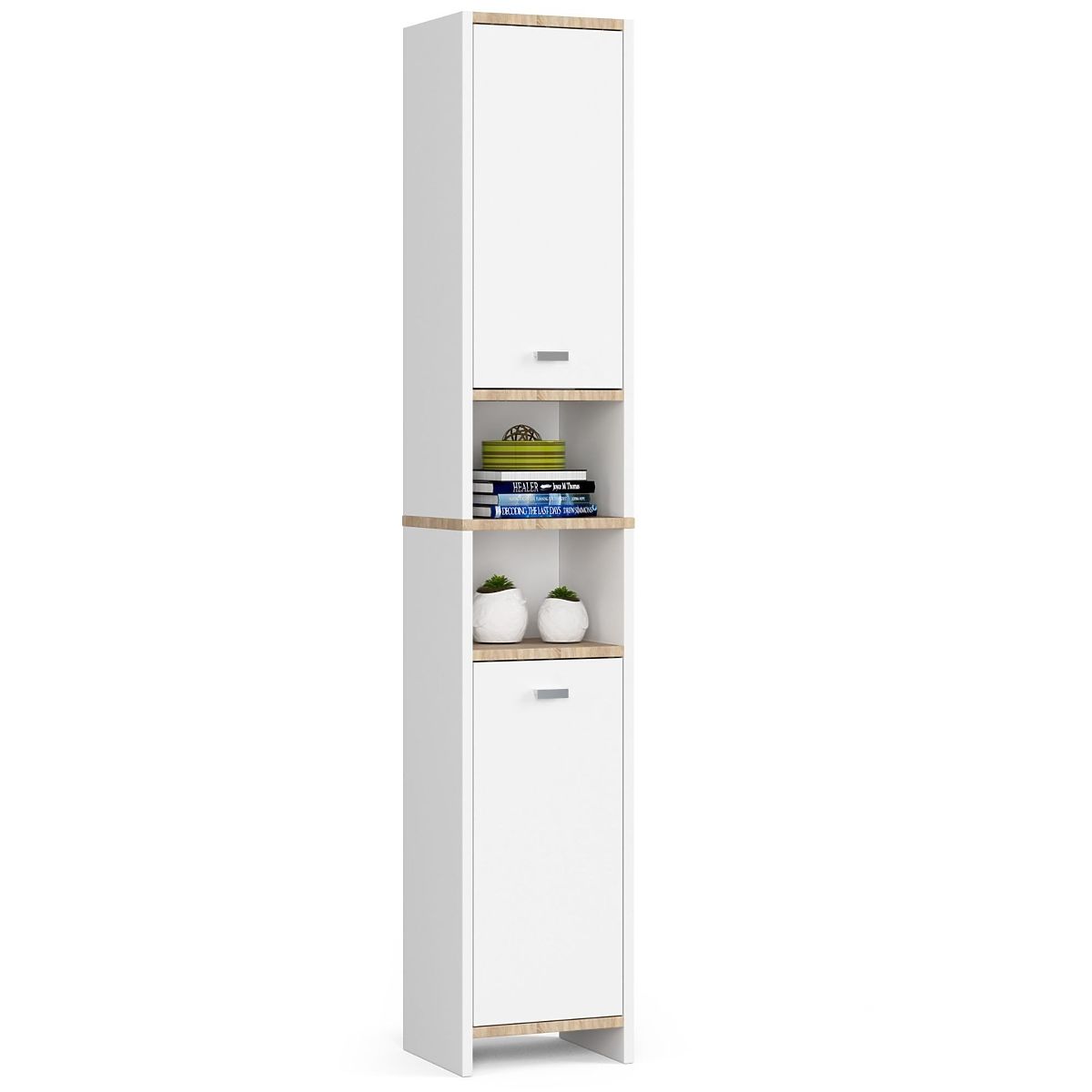 Bílý koupelnový regál s 4 policemi a 2 dveřmi. .. více