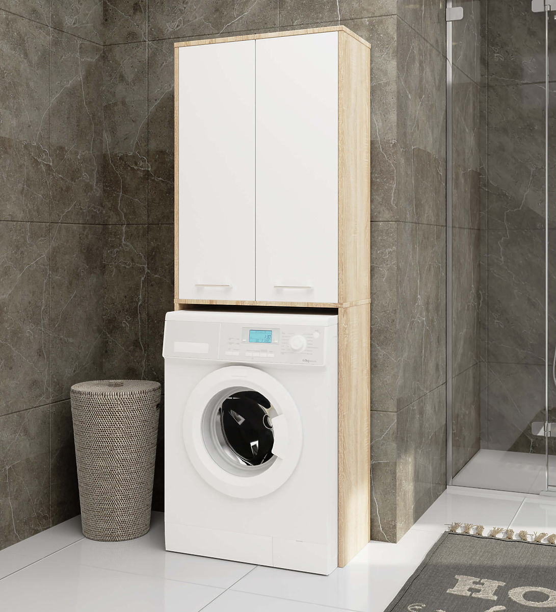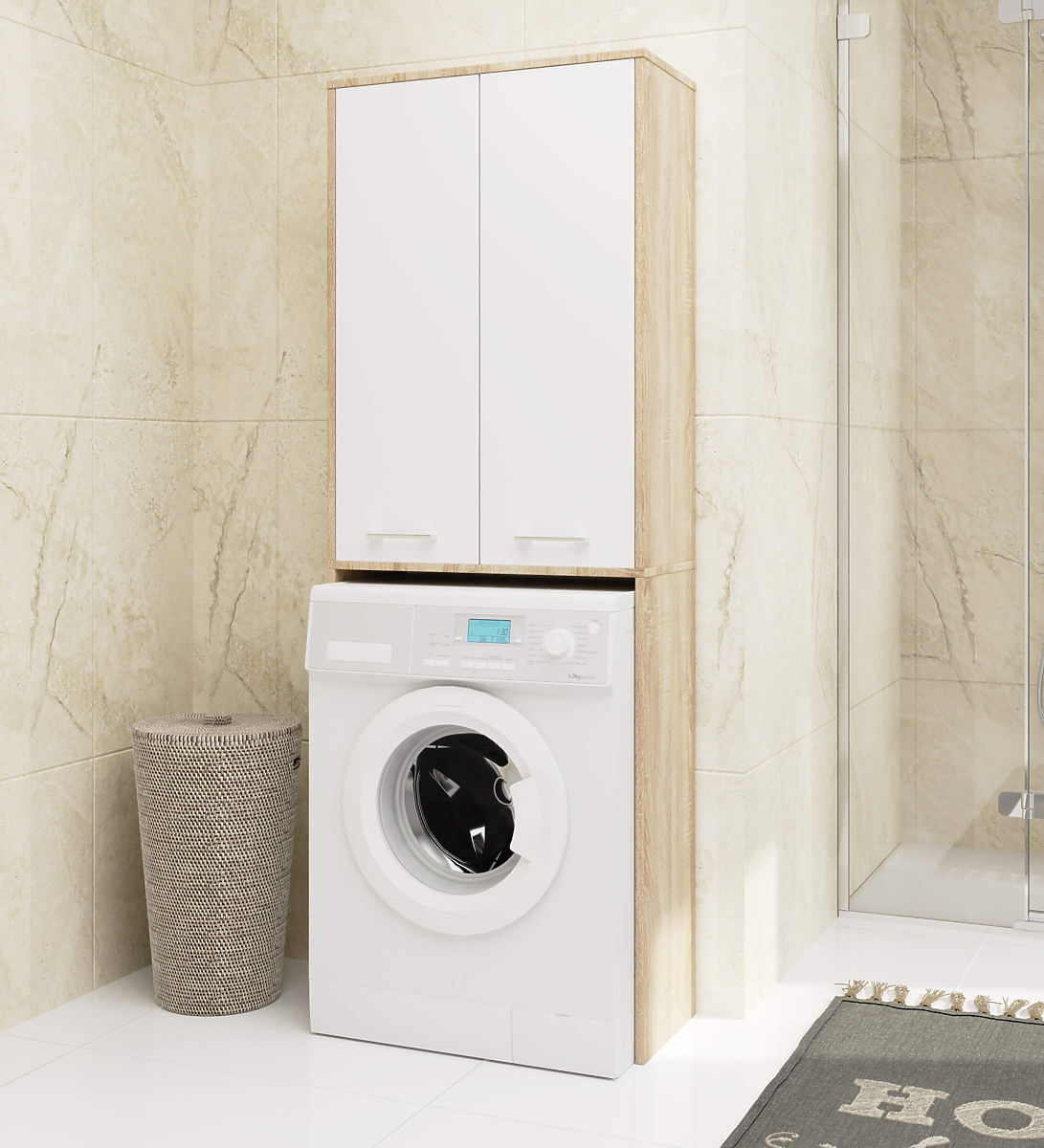 Chceme-li, aby naše koupelna byla zařízena pohodlně a zároveň stylově, měli bychom se zaměřit na solidně a funkčně vyrobený nábytek. Takovým je určitě skříňka nad pračku. Je to ideální způsob, jak využít prostor nad pračkou, který obvykle zůstává nevyužitý. Optimální rozměry tohoto sloupku z něj činí skvělé řešení pro koupelny s malou plochou. Ergonomický tvar umožňuje jeho využití v každé místnosti. Tento nábytek, skládající se z nástavce nad pračku a skříňky nad ním, vytváří velké množství úložného prostoru pro různé předměty. Do skříňky uložíme například detergenty nebo hygienické prostředky. Tyto police jsou vytvořeny pro uložení osobní kosmetiky nebo ručníků. Krásný odstín, jakým je dub sonoma s bílými čely, nám zaručuje elegantní vzhled koupelny. Laminovaná deska, ze které je tato skříňka vyrobena, je vysoce kvalitní materiál. Zajišťuje trvanlivost a pevnost nábytku, a také zachování jeho estetického vzhledu.
