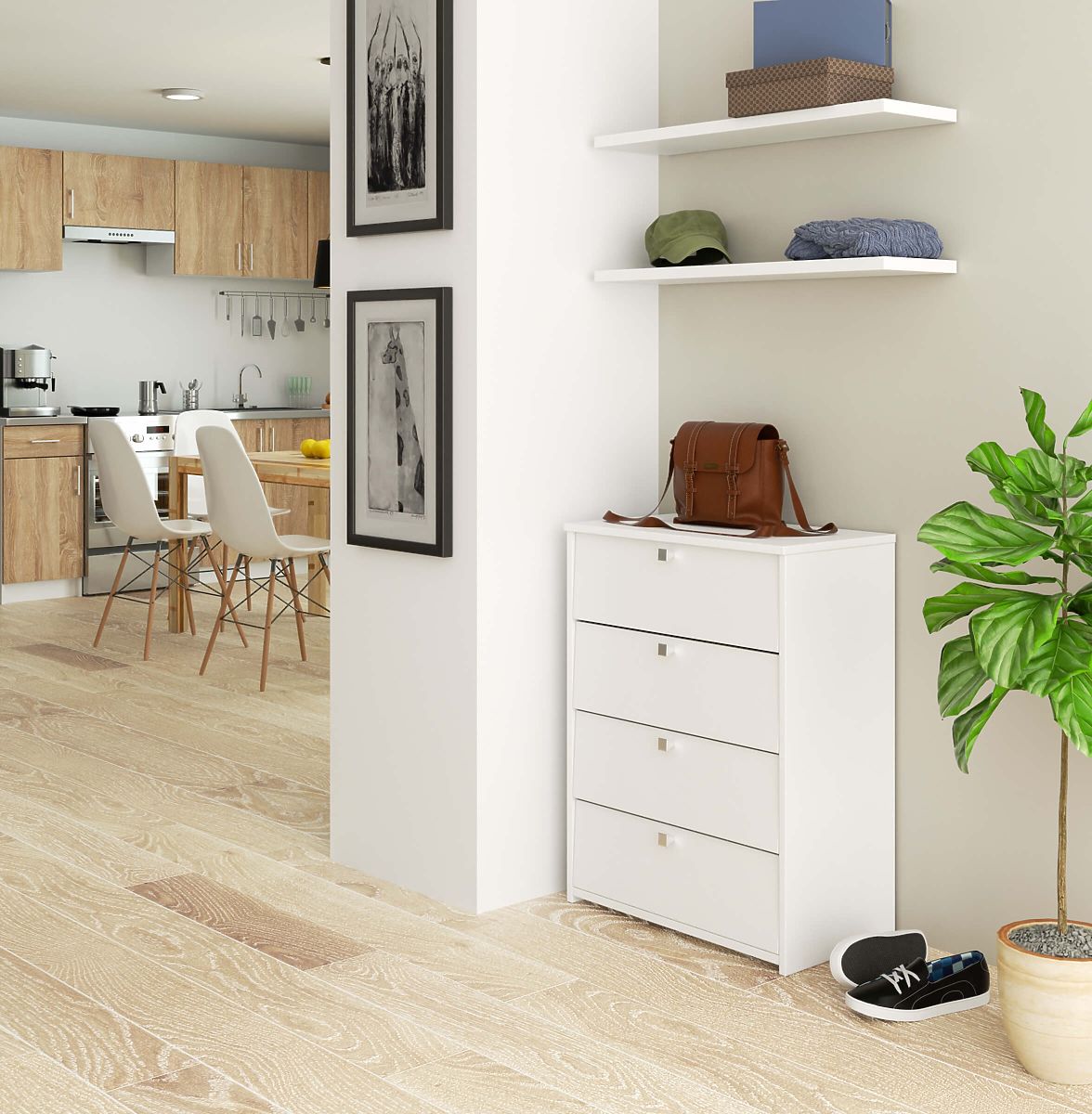Pohodlný botník v módní a nadčasové bílé barvě je určen pro ty, kteří si cení skandinávského stylu interiérového designu, jednoduchosti a elegance v nejlepším provedení. Precizní kvalita zpracování, zajímavý vzhled a univerzální barva zajišťují, že botník bude dokonale ladit do každé předsíně. Nabízíme vám konkurenceschopnou cenu za praktický a efektní nábytek, který umožní uspořádání obuvi v každém bytě.