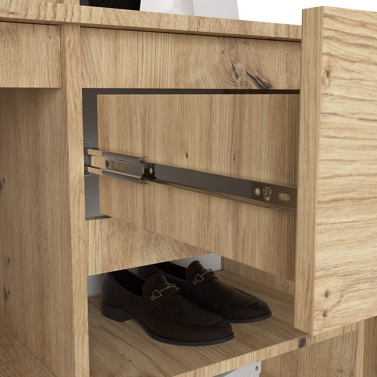 Skříň do předsíně ENTRO je vybavena skříňkou se zrcadlem, dvěma menšími skříňkami s vnitřními policemi, zásuvkou, 5 věšáky ve formě háčků a další policí nad věšáky. Takové uspořádání činí nábytek multifunkčním a překvapivě prostorným. Ve skříňce se zrcadlem je praktická tyč na zavěšení oblečení. Otevřená police je užitečná pro odkládání každodenních drobností. Mělká skříň do předsíně nezabírá mnoho místa, takže ji lze úspěšně umístit i do malých a úzkých prostor. Výzdobu elegantně doplní další nábytek do předsíně z nabídky Fabryki Mebli AKORD.