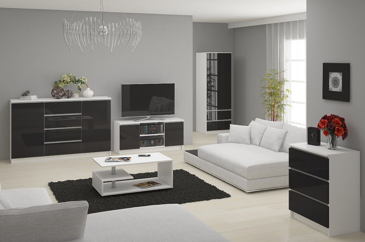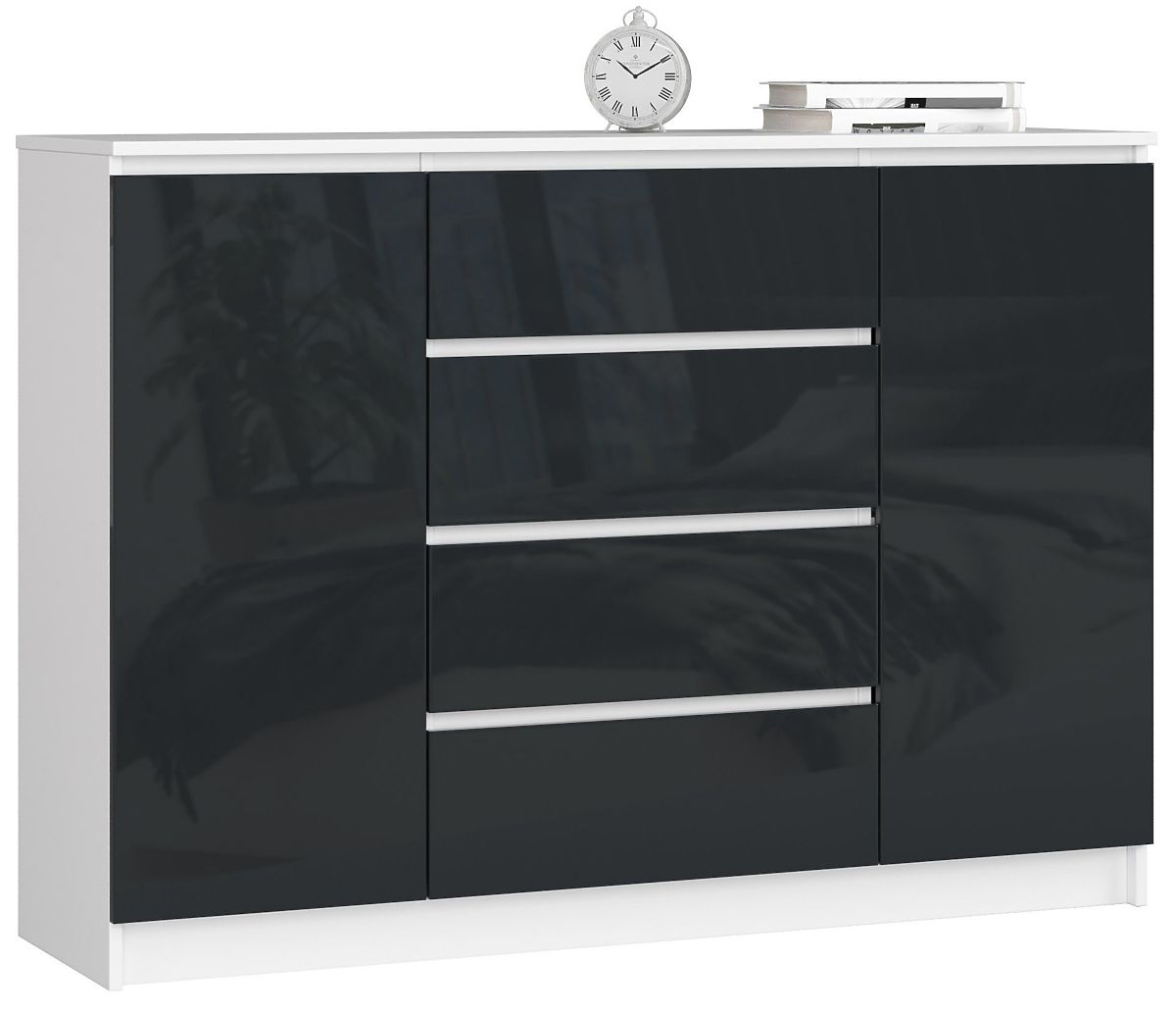 Dvoubarevná komoda K 140 se 2 skříňkami a 4 zásuvkami je vyrobena z MDF desky s akrylovým povrchem (výrobce Kronospan). Korpus nábytku je v bílé barvě, zatímco čela skříněk a zásuvek jsou z kontrastní desky ve vysokém lesku v grafitové barvě. Komoda je navržena symetricky. Její střední část tvoří řada 4 zásuvek, zatímco levá a pravá strana jsou skříňky s jednotlivými dveřmi otevíranými směrem ven. Zásuvky jsou vysouvány díky kovovým válečkovým pojezdům a poskytují pohodlné úložné prostory díky velkému prostoru. Každá skříňka komody je vybavena 2 policemi.