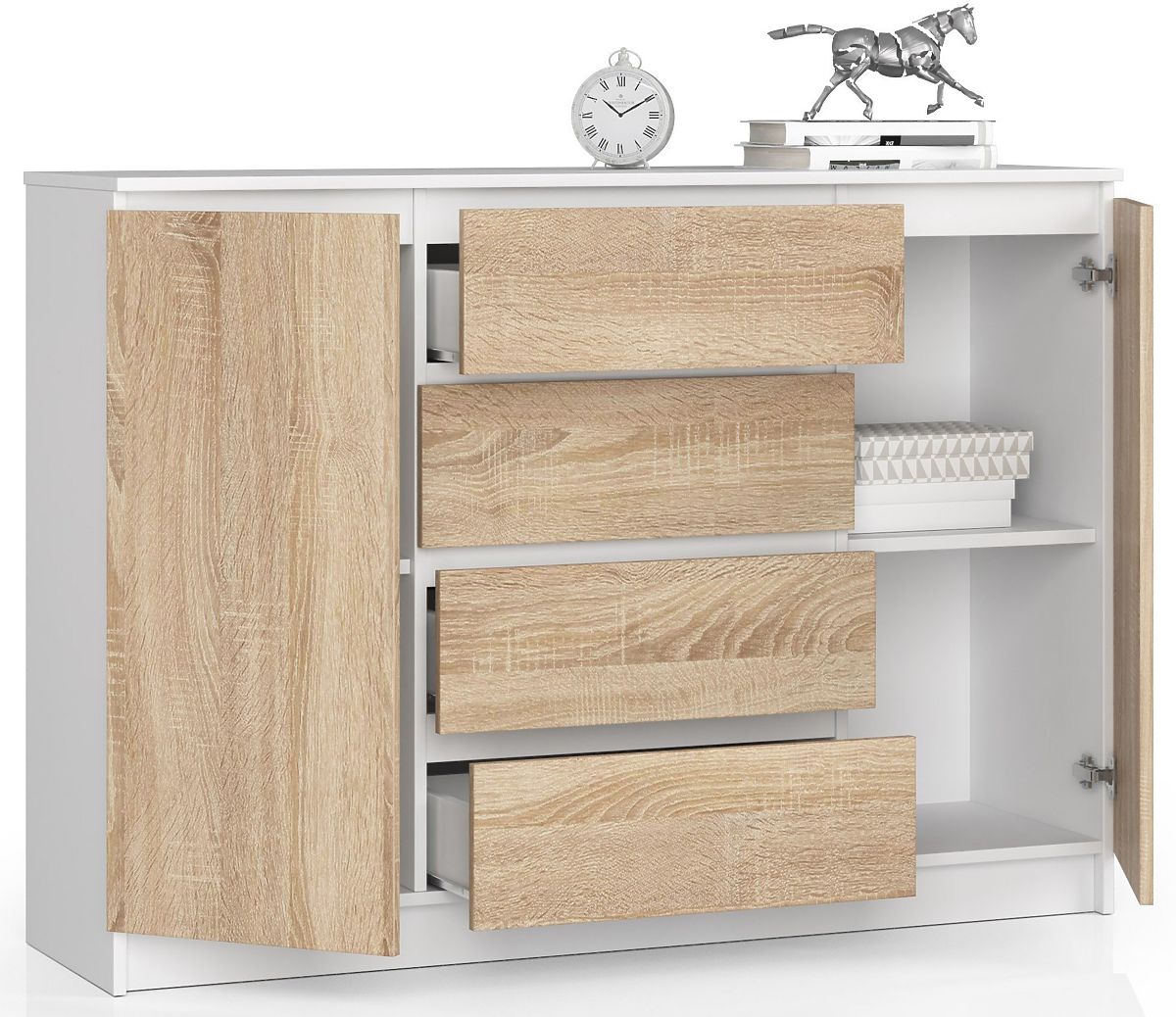 Komoda K 140 v barvě dubu sonoma a bílé je univerzální nábytek, který může plnit mnoho funkcí a skvěle se hodí do různých místností. Skvěle poslouží jako prádelník v ložnici nebo dětském pokoji. Může pojmout také různé drobnosti, usnadňující udržení pořádku v obývacím pokoji, skrýt méně používané nádobí v jídelně, nebo dokonce sloužit jako úložný prostor pro čepice, šály či klíče v předsíni.