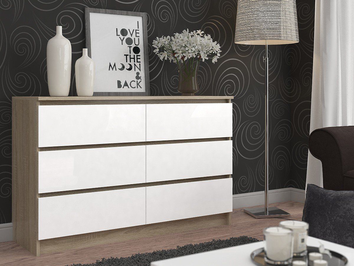 Komoda s 6 zásuvkami a moderním mixem barev dub sonoma a bílá. .. více