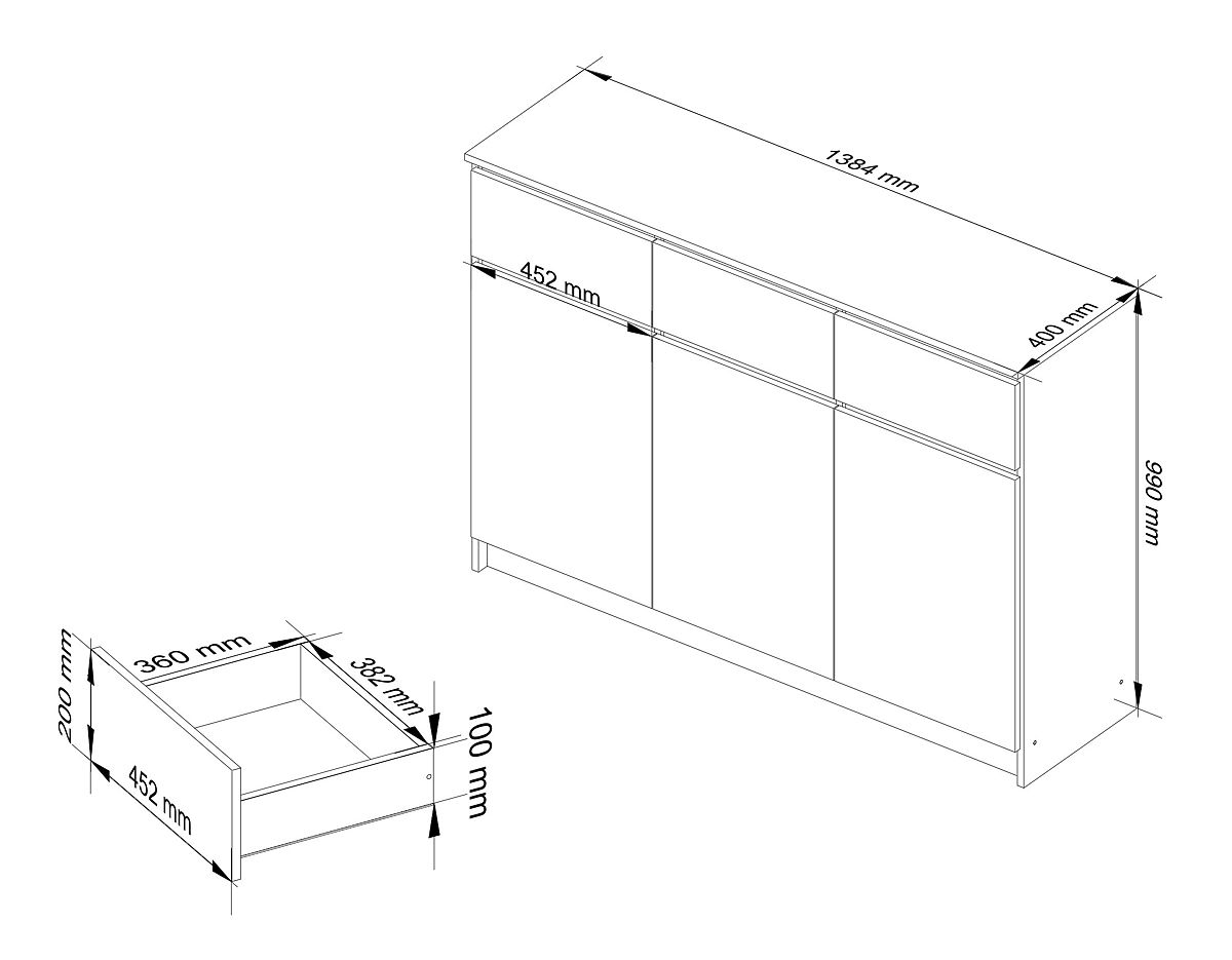 Komoda K140 s třemi skříňkami a zásuvkami z laminované desky. .. více
