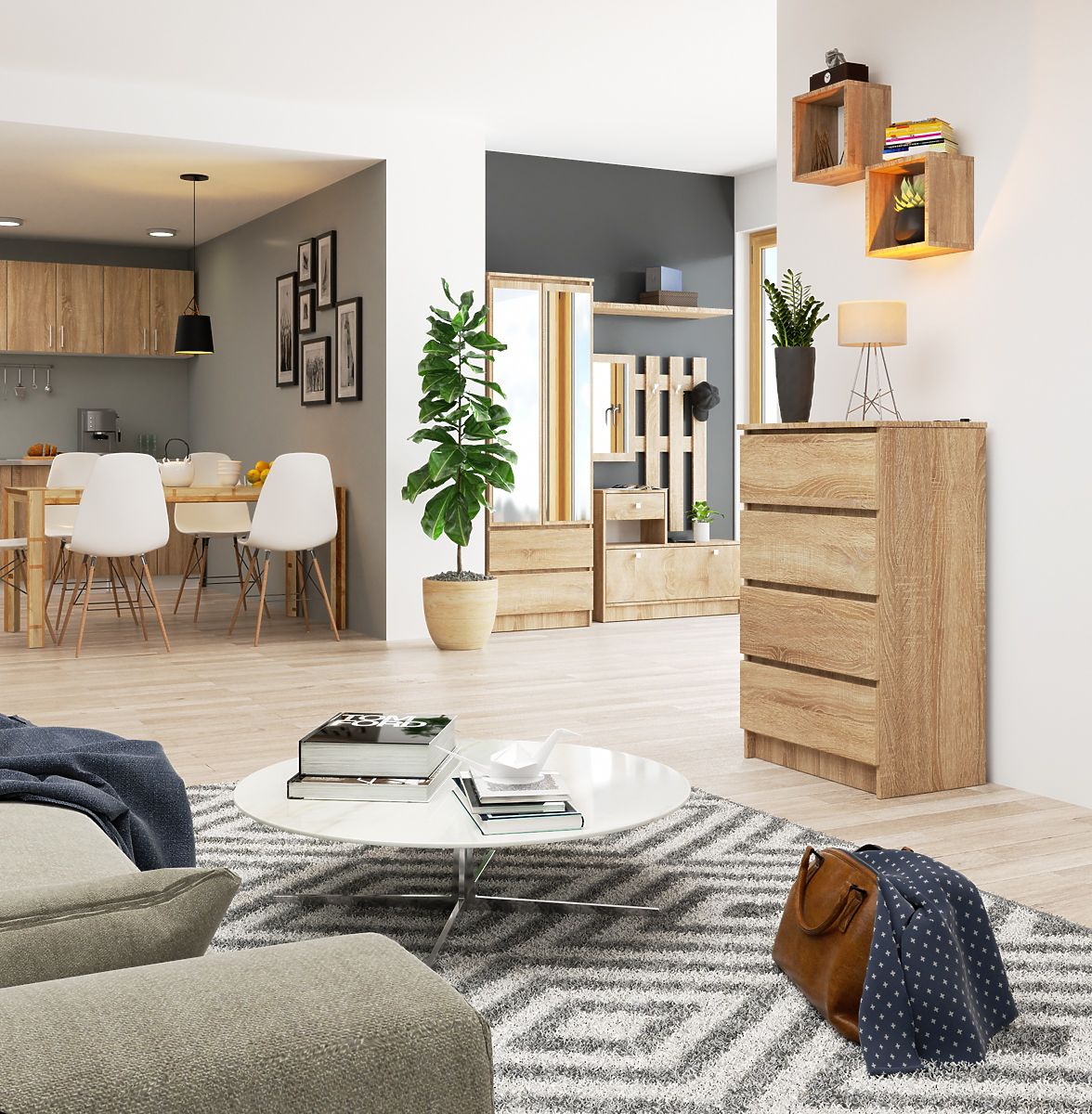 Malá komoda K60 je návrh udržovaný v módní, velmi oblíbené barevnosti mezi zákazníky. Samozřejmě jde o dub sonoma - odstín, který skvěle zapadá do moderních interiérů, je velmi univerzální a úžasně se kombinuje se všemi ostatními barvami. Samotná komoda je nábytek vysoké kvality, který je vybaven čtyřmi praktickými zásuvkami. Návrh je určen pro osoby, které chtějí vybavit svůj obývací pokoj, ložnici, předsíň, jídelnu, ale také kancelářský interiér. Vysoká kvalita v kombinaci s nízkou cenou jistě přesvědčí zákazníky, kteří si cení jednoduchosti a elegance v nejlepším provedení. Ke komodě můžete přizpůsobit další nábytek z téže kolekce, čímž vytvoříte vysněnou aranžaci libovolně vybraného prostoru.