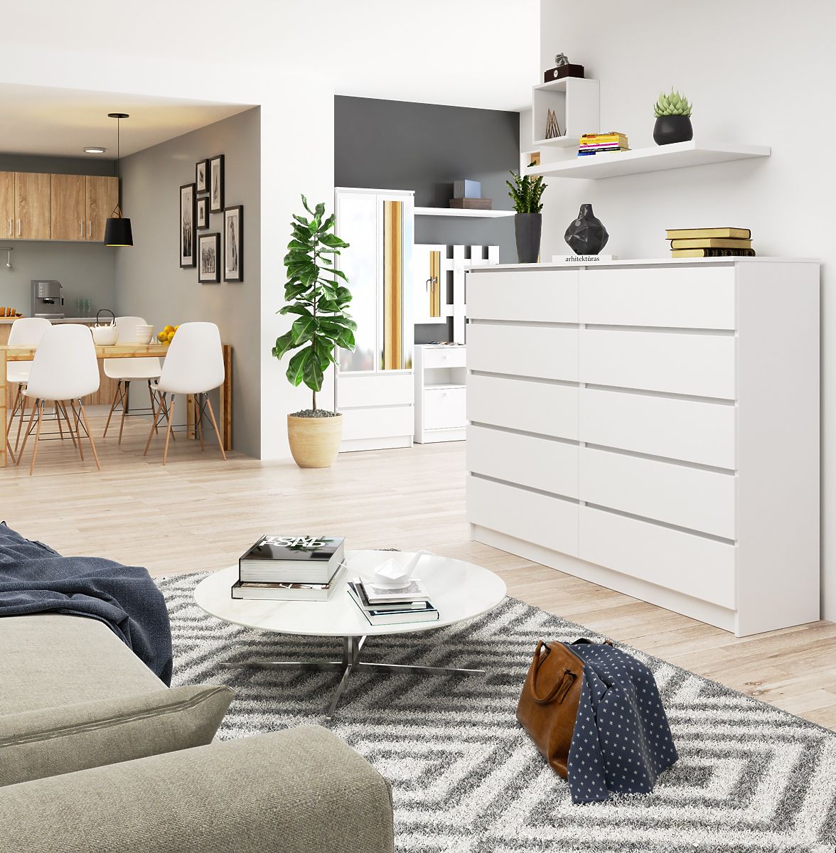 Komoda je vybavena deseti prostornými zásuvkami, které pojmou všechny potřebné předměty. Univerzální a nadčasová bílá barva umožňuje kombinovat komodu s různými druhy nábytku v různých barevných odstínech. Produkt je vyroben z laminované desky o tloušťce 16 milimetrů odolné proti oděru. Hrany jsou olepeny ABS hranou.