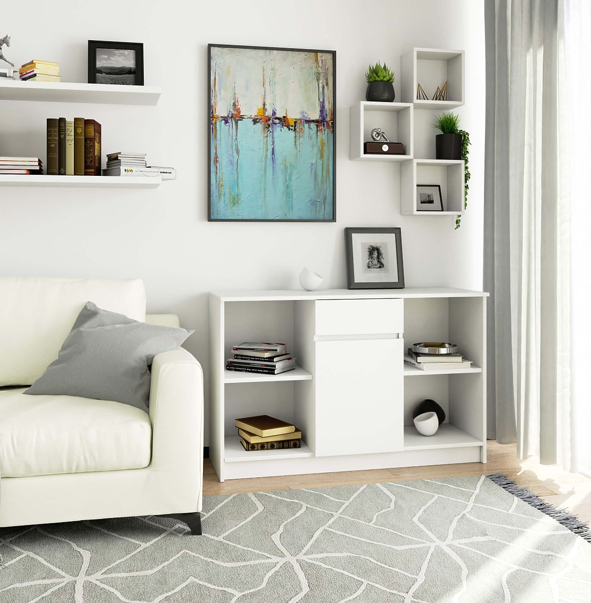 Bílá komoda s modulární konstrukcí a jednou zásuvkou. .. více
