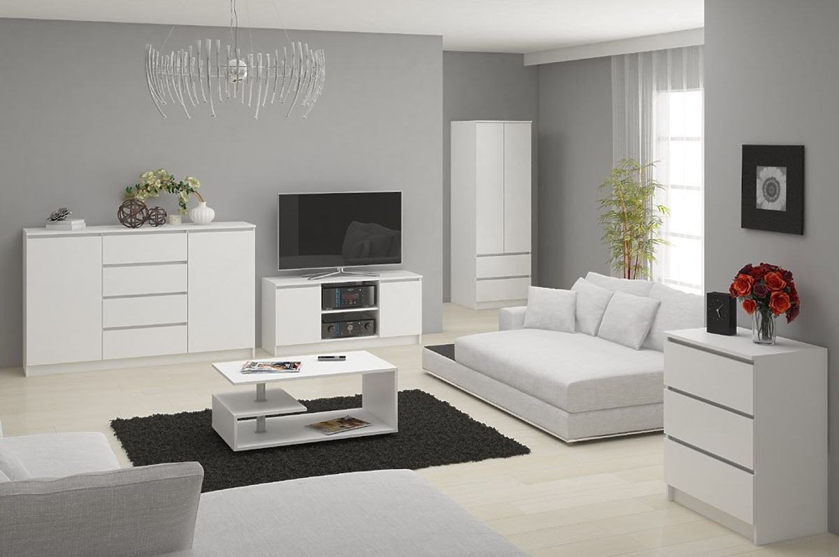 S potěšením představujeme jednu z možností, kterou je bílá komoda vybavená čtyřmi zásuvkami a dvěma skříňkami s policemi. Nábytek je vyroben z laminované desky o tloušťce 16 milimetrů, která vykazuje vysokou odolnost proti oděru. Hrany jsou olepeny ABS hranou. Praktický nábytek se jistě krásně uplatní jak v obývacím pokoji, tak v ložnici. Může být také použit v hostinském pokoji, studentském pokoji, jídelně, předsíni, kancelářské nebo hotelové místnosti. Stojí za zmínku velmi dobrá kvalita, pečlivé a solidní zpracování a konkurenceschopná cena.