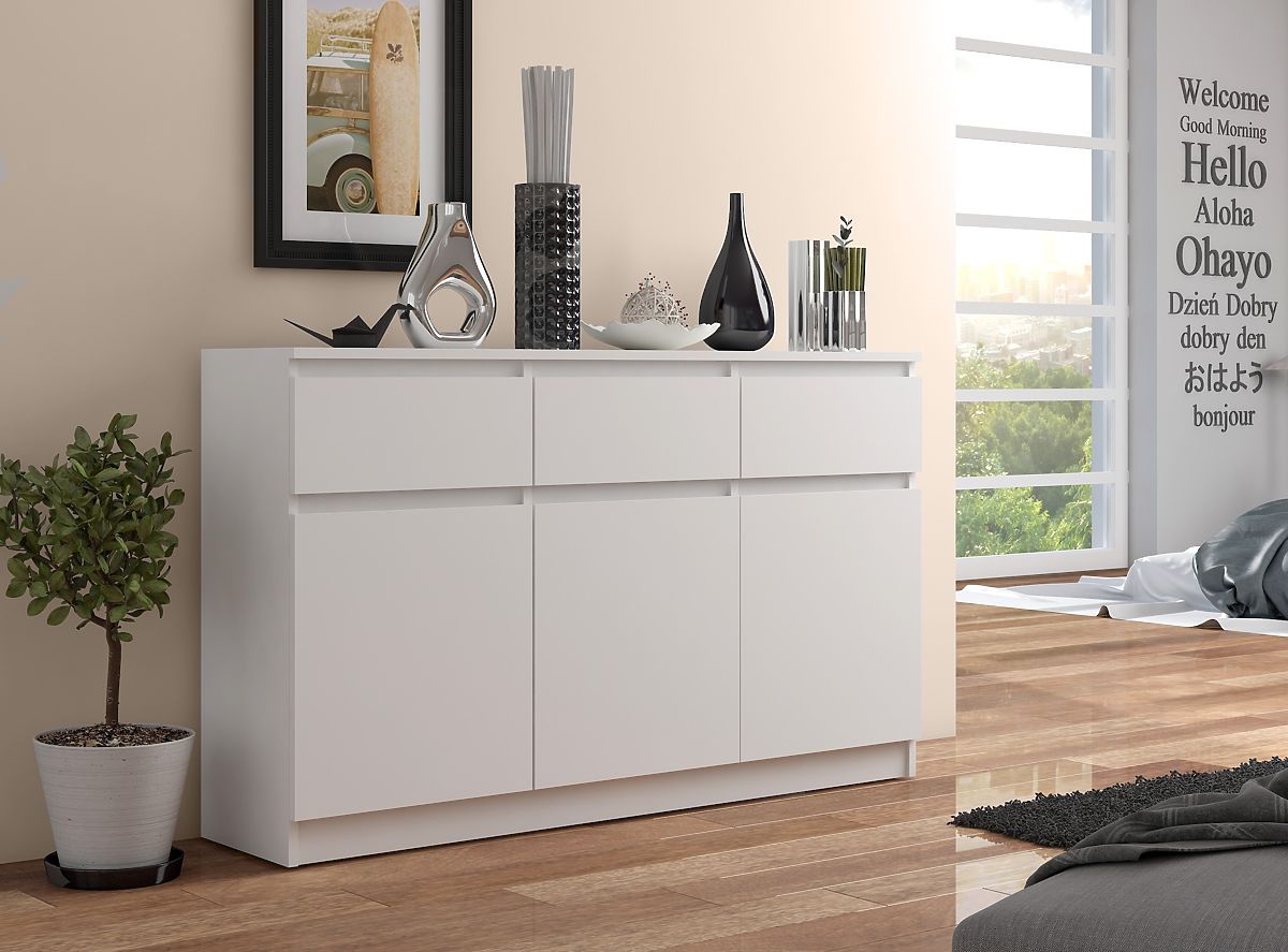 Představujeme mimořádně elegantní komodu, vyrobenou z vysoce kvalitní laminované desky. Má tloušťku 16 mm a je odolná proti oděru. Pochází od uznávaného výrobce Kronospan, což zaručuje její trvanlivost. Komoda má tři zásuvky a tři skříňky. Zásuvky se pohybují na kovových kuličkových pojezdech, což zajišťuje plynulost a lehkost při jejich otevírání a zavírání. Každá skříňka má prostornou polici, kterou lze otevřít pomocí dvířek. Hrany nábytku jsou olepeny ABS hranou, která poskytuje vysokou ochranu proti poškození.