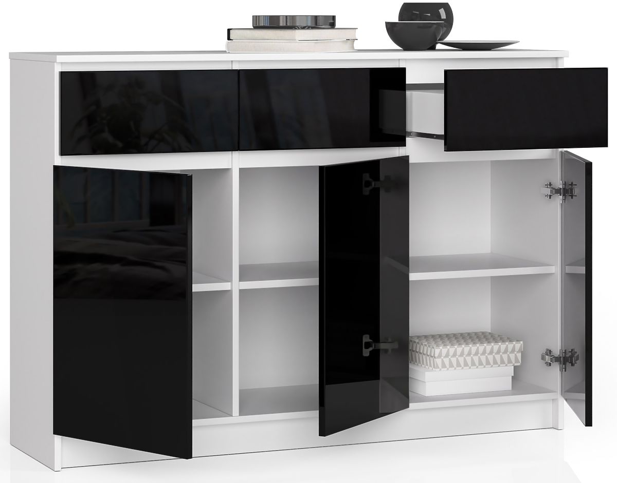 Komoda s černými lesklými čelními stranami a bílým matným tělem. .. více