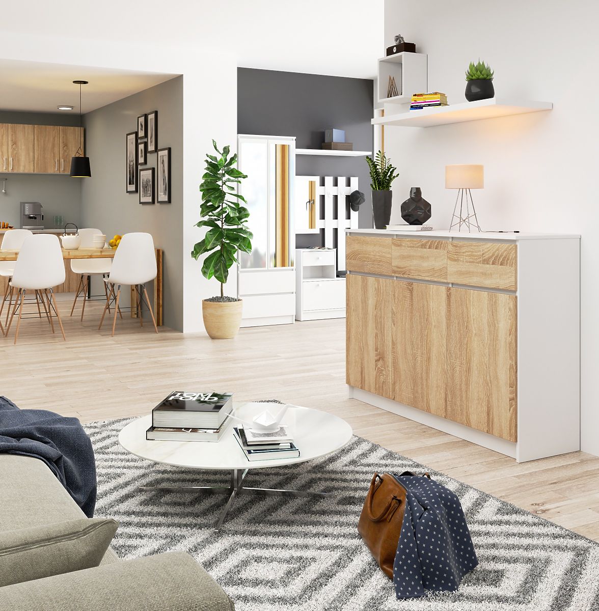 Bílá komoda s čely v dekoru dub Sonoma, 3 zásuvky a 3 dveře. .. více