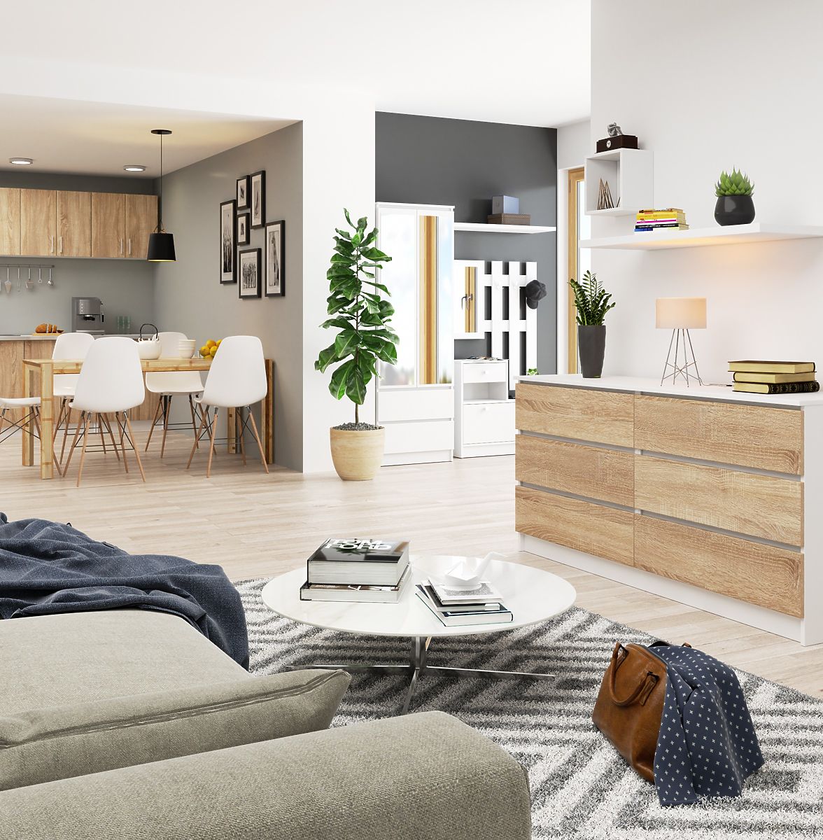Postarejte se o co nejlepší využití prostoru vašeho obývacího pokoje a zároveň ho zařiďte esteticky. Pomůže vám s tím komoda z našeho obchodu, jejíž barva je bílá/sonoma. Je vyrobena z vysoce kvalitní laminované desky, která je navíc odolná proti oděru. Komoda je navíc vybavena ABS hranami pro zajištění ochrany proti poškození.