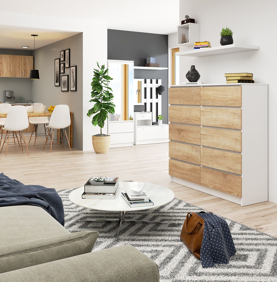 Komody jsou funkční nábytek, bez kterého si těžko představit bydlení. Umožňují uspořádat textilie a další předměty. Někdy je jich opravdu hodně. V takovém případě se vyplatí zvolit bílou komodu K 120 cm s čely zásuvek v barvě sonoma - obsahuje až 10 zásuvek, což poskytuje mnoho volného prostoru k využití. Nejlépe ji umístit do obývacího pokoje, ložnice nebo předsíně.