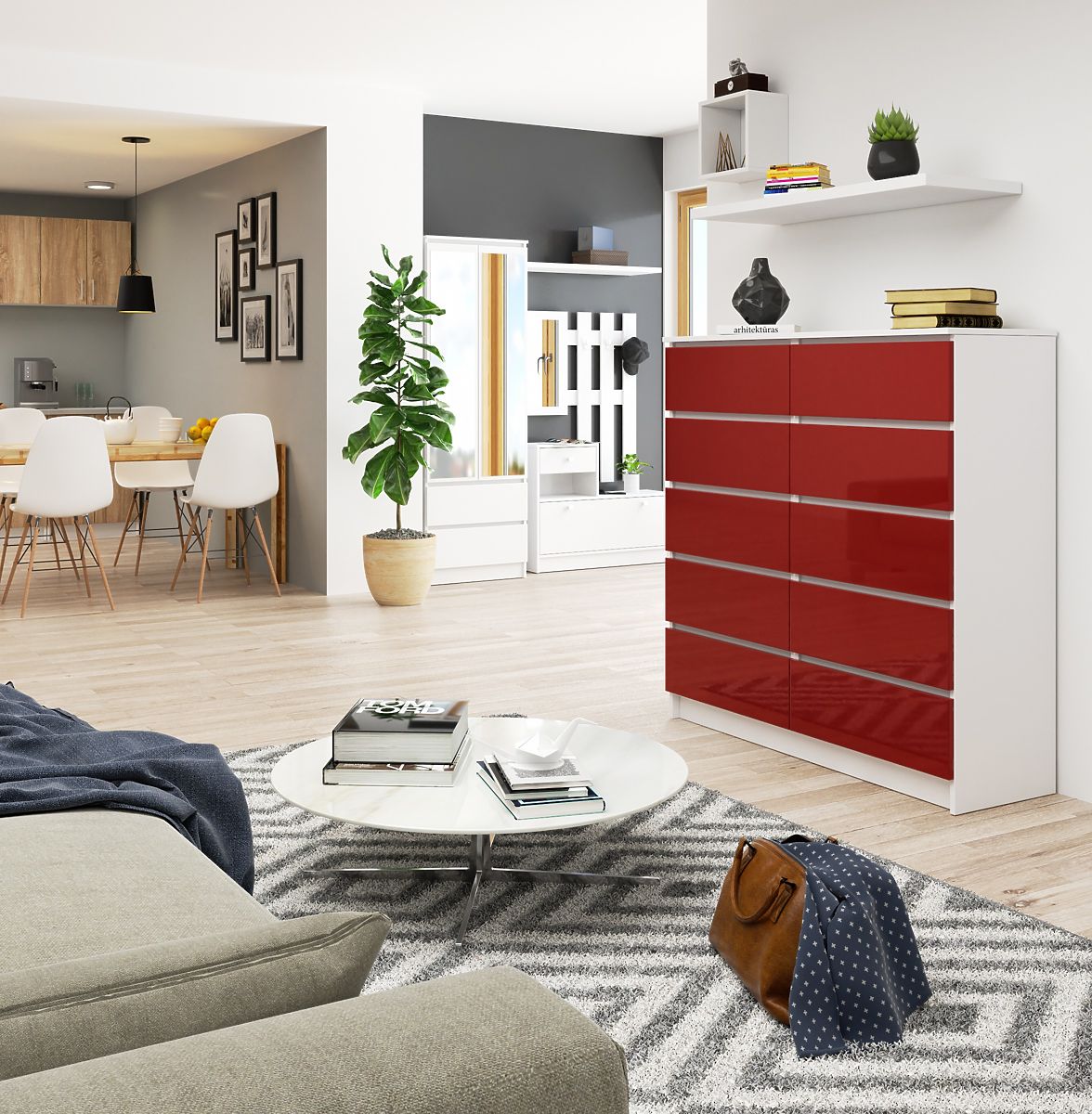 Komoda, model K je nábytek s výraznou, energetickou barvou. Hluboká červená čel s lesklým povrchem a bílý matný korpus vypadají velmi zajímavě. Dojem umocňuje lesklá struktura, která odráží světlo a vytváří na povrchu nábytku efektní odlesky.