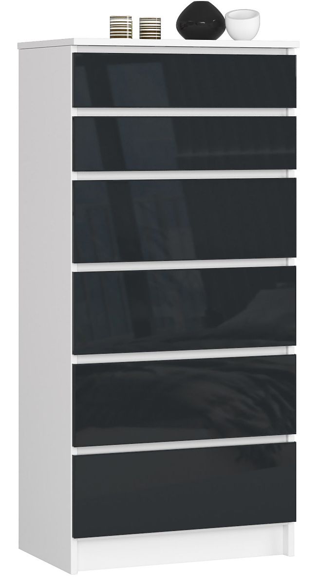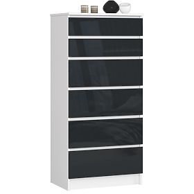 Funkční komoda s šesti grafitovými zásuvkami a bílým lesklým korpusem. .. více