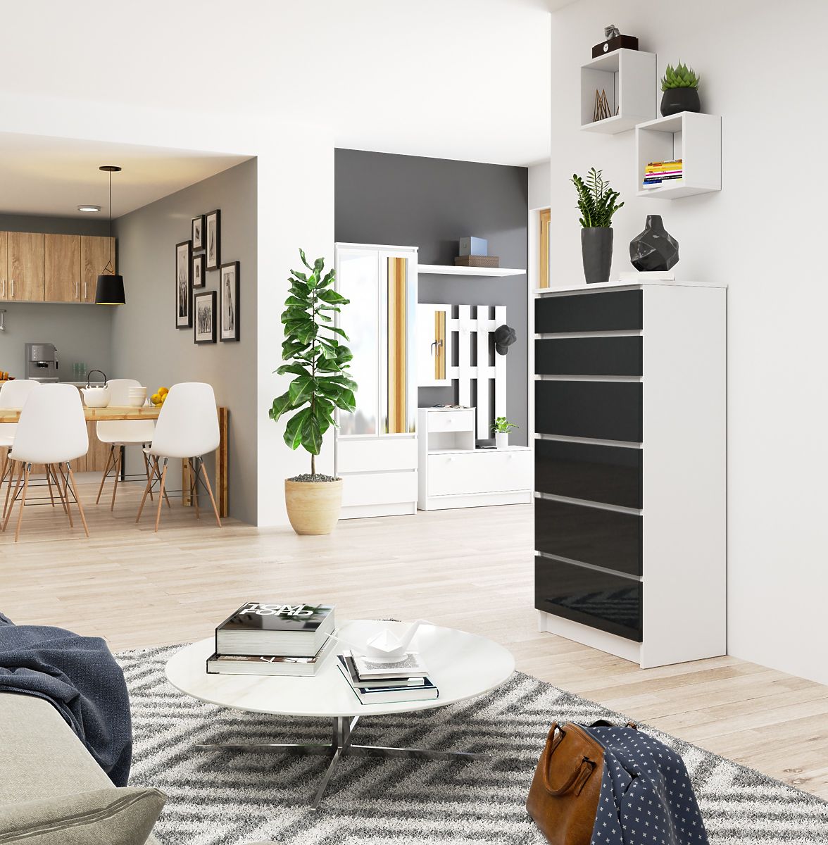 Komody K jsou funkční nábytek, který se hodí jak do obývacích pokojů, ložnic, předsíní, tak i do pracovního prostoru v domácnosti nebo bytě. Díky lesklé bílé barvě korpusu a šesti grafitovým zásuvkám se jemně začlení do daného prostoru. Je také multifunkční — lze v ní pohodlně ukládat oblečení, prádlo nebo dokumenty. Navíc na ni můžete umístit různé dekorace, jako květiny v květináčích nebo váze, nebo rodinné památky, fotografie.