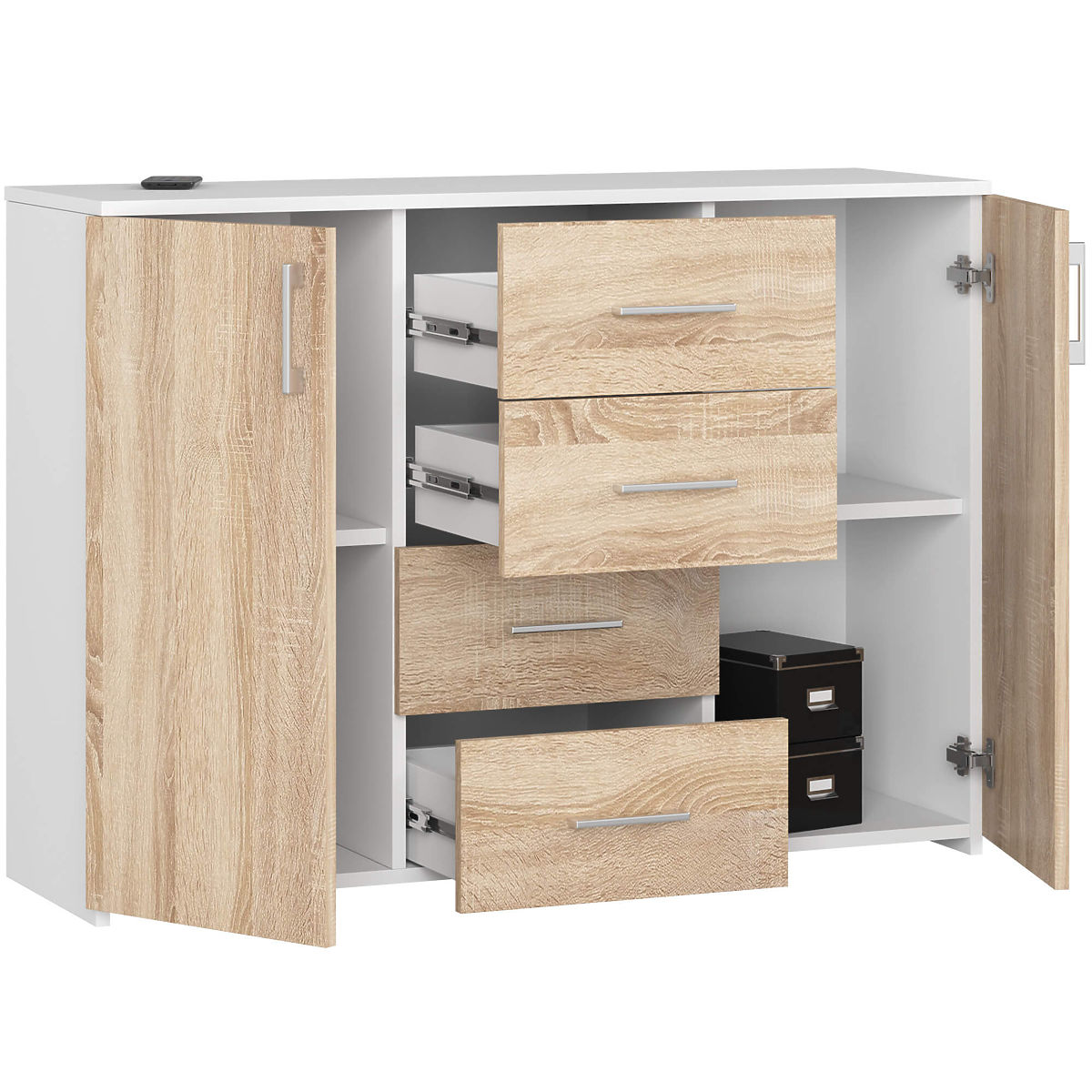 Komoda s bílými a dubovými čely, 4 zásuvky, 2 dveře. .. více