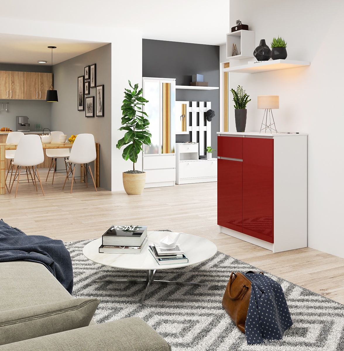 Červená lesklá komoda s bílým korpusem a praktickým úložným prostorem. .. více