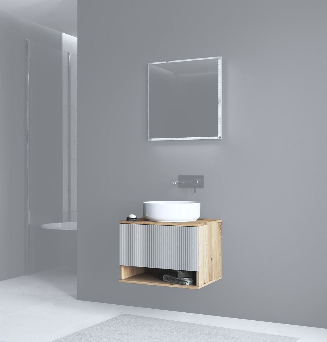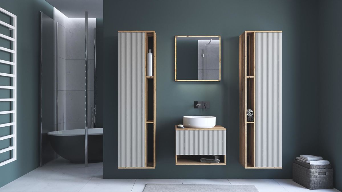 Koupelnová skříňka v kombinaci dekoru dub artisan a matného kašmírového odstínu nabízí moderní a nadčasový vzhled, který se snadno začlení do různých typů koupelen. Harmonické spojení teplého dřeva a jemných tónů dodává interiéru elegantní a luxusní charakter.
