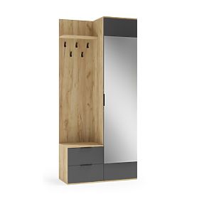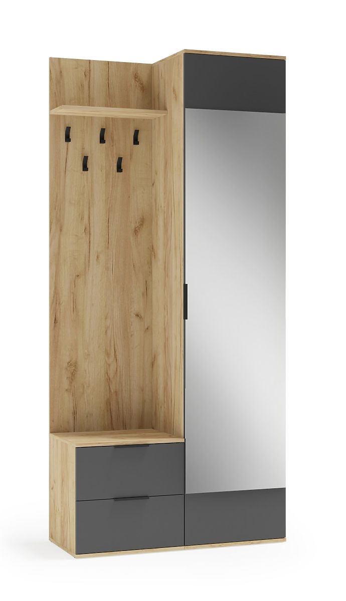 Sestava obsahuje praktickou skříňku, dvě zásuvky, poličku, věšákový panel s háčky na oblečení a zrcadlo, které opticky zvětšuje prostor a umožňuje rychlou kontrolu vzhledu před odchodem z domu.